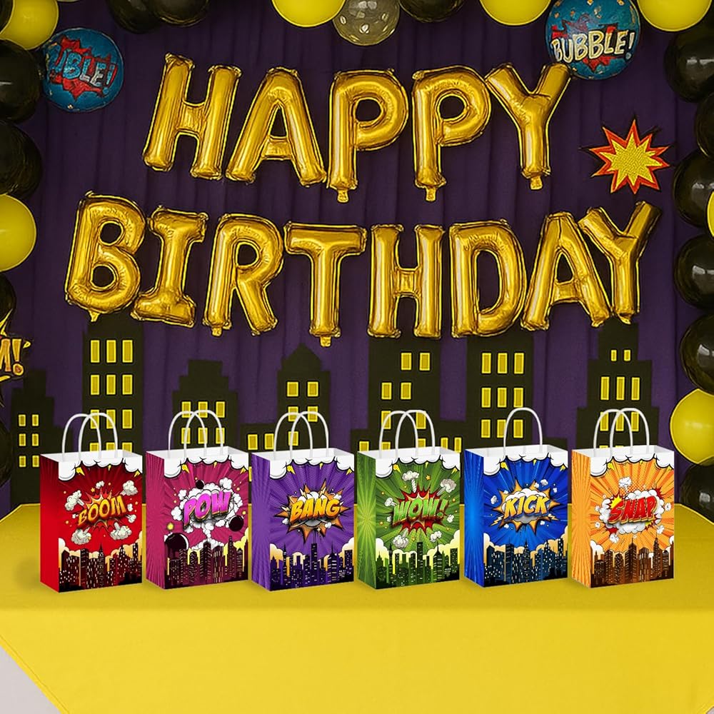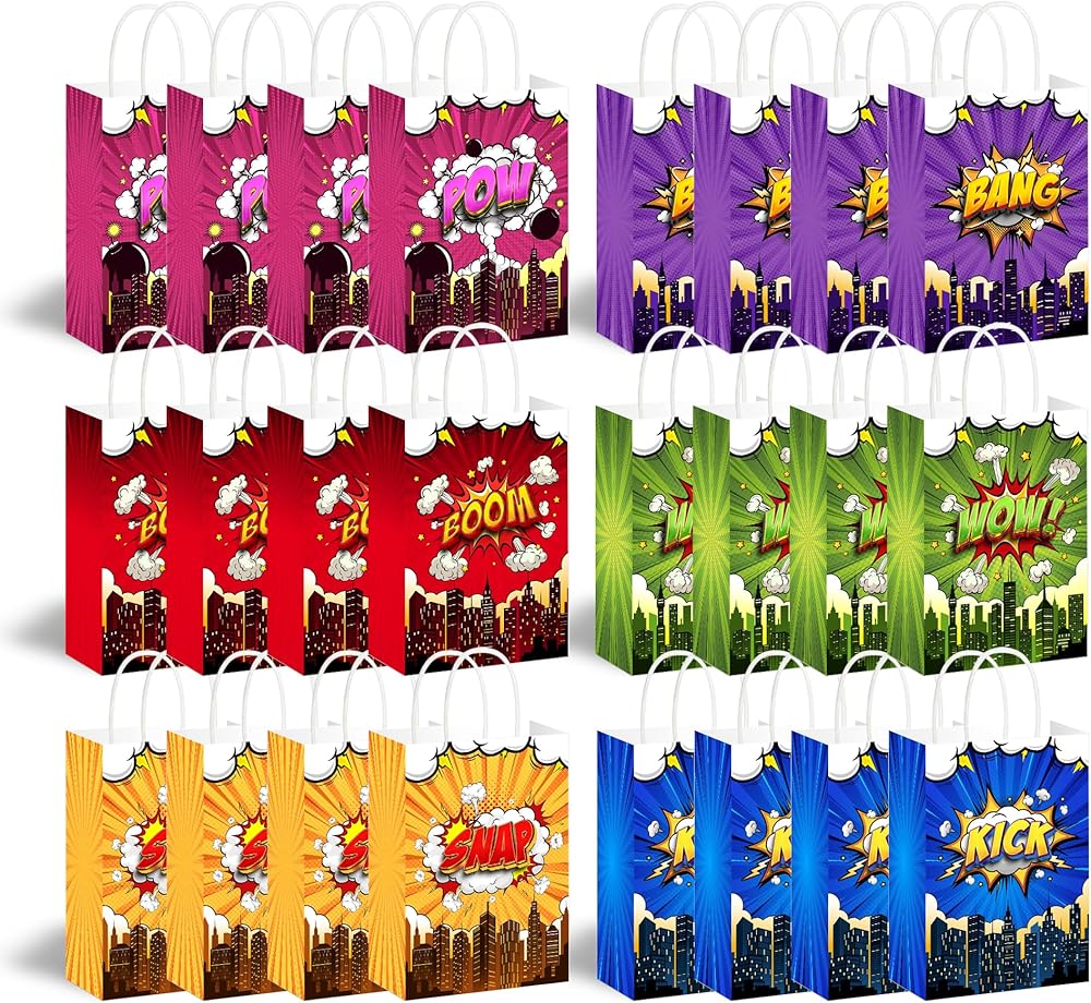 Suitable Size: 8.26"W x 5.9"H x 3.14"D (21x15x8cm) environmentally-friendly kraft paper gift bag, which is suitable for storing various delicate gifts, such as toys, books, puzzles, chocolates, sweets, toys, and more, they make distributing hero birthday favors a breeze, ensuring guests leave with a smile. Package Include: you will receive 24 pieces hero party favor bags with Handle, made of kraft paper,printed with 6 different patterns,and each patterns have 4 pieces. these present bags are good ideal decorations for hero themed party, they can give more choice for you. And this quantity will meet your needs for themed parties usage. Quality Paper Construction: crafted from quality paper, our hero goodie bags are both strong and elegant; Safe and sturdy, featuring a comfortable handle and a solid flat bottom, making them not just visually appealing but practical for hero birthday favors. Captivating Hero Theme Design: enhance your hero party with our goodie bags showcasing vibrant hero patterns—Boom, Pow, Wow, Kick—against city backdrops; These hero birthday decorations offer vivid appeal, making them memorable additions to your hero-themed celebration. This product is suitable for children aged 3 and up. Our Service: Enjoy 24-hour professional customer service for prompt issue resolution; backed by our money-back guarantee for your peace of mind.