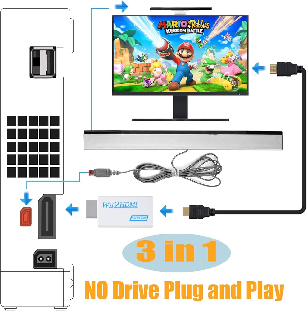 محول وي HDMI 3 في 1 من كودكاي من وي الى محول HDMI للتلفزيون الذكي + شريط مستشعر حركة سلكي + كيبل HDMI عالي السرعة بطول 5 قدم متوافق مع نينتندو وي