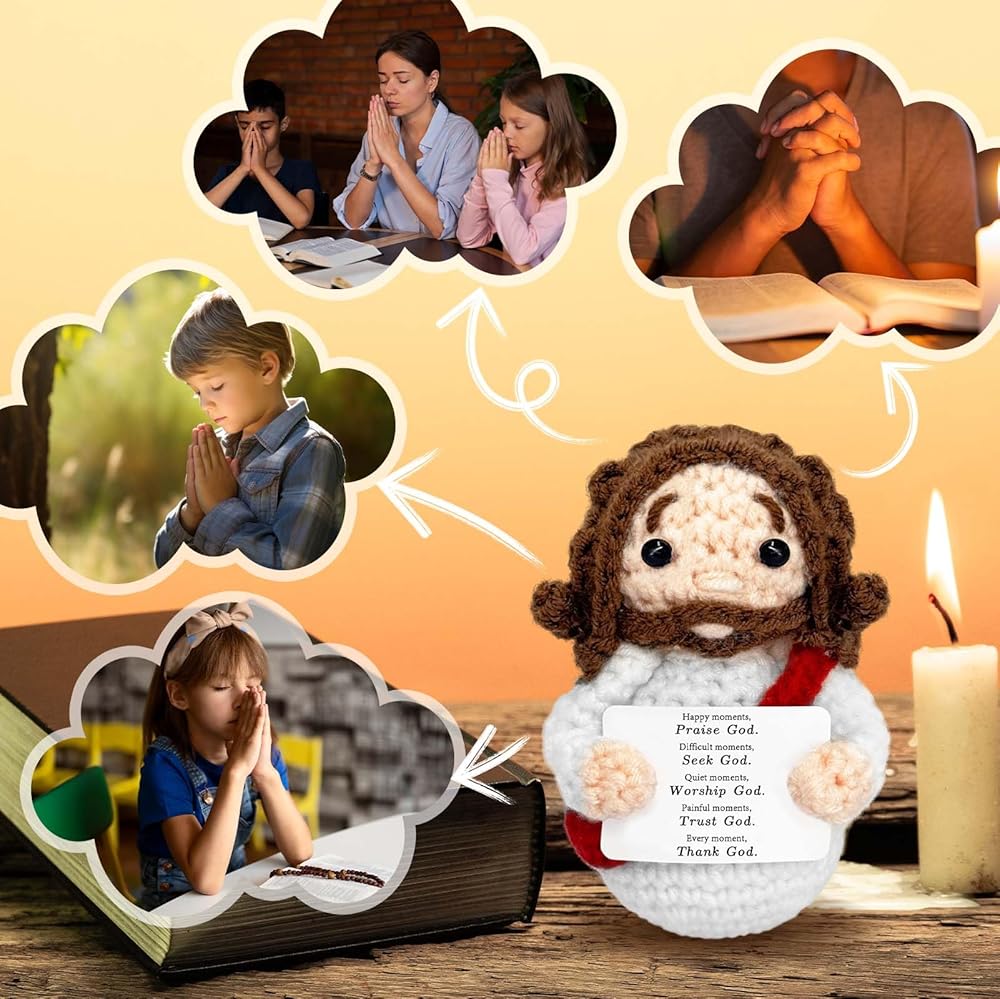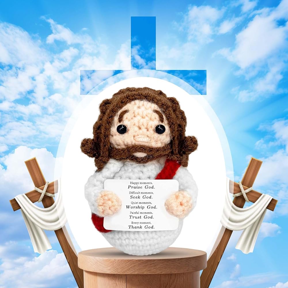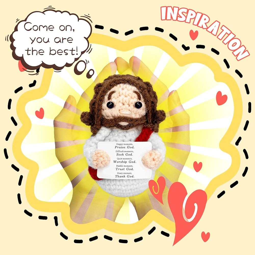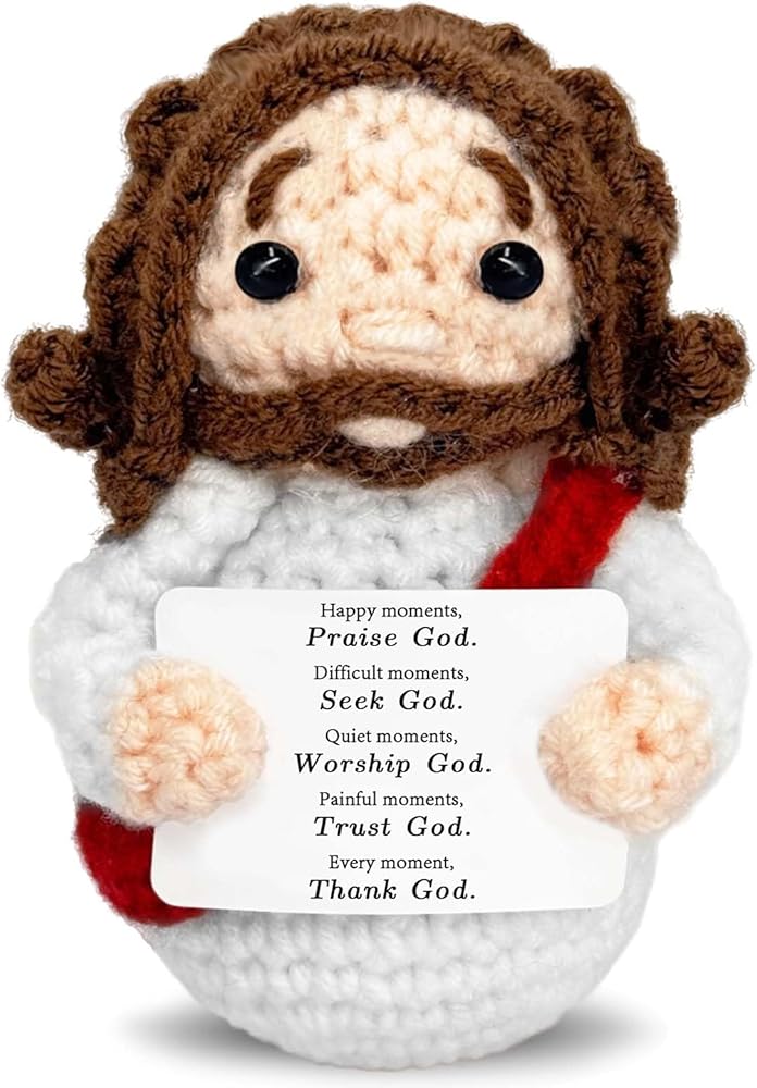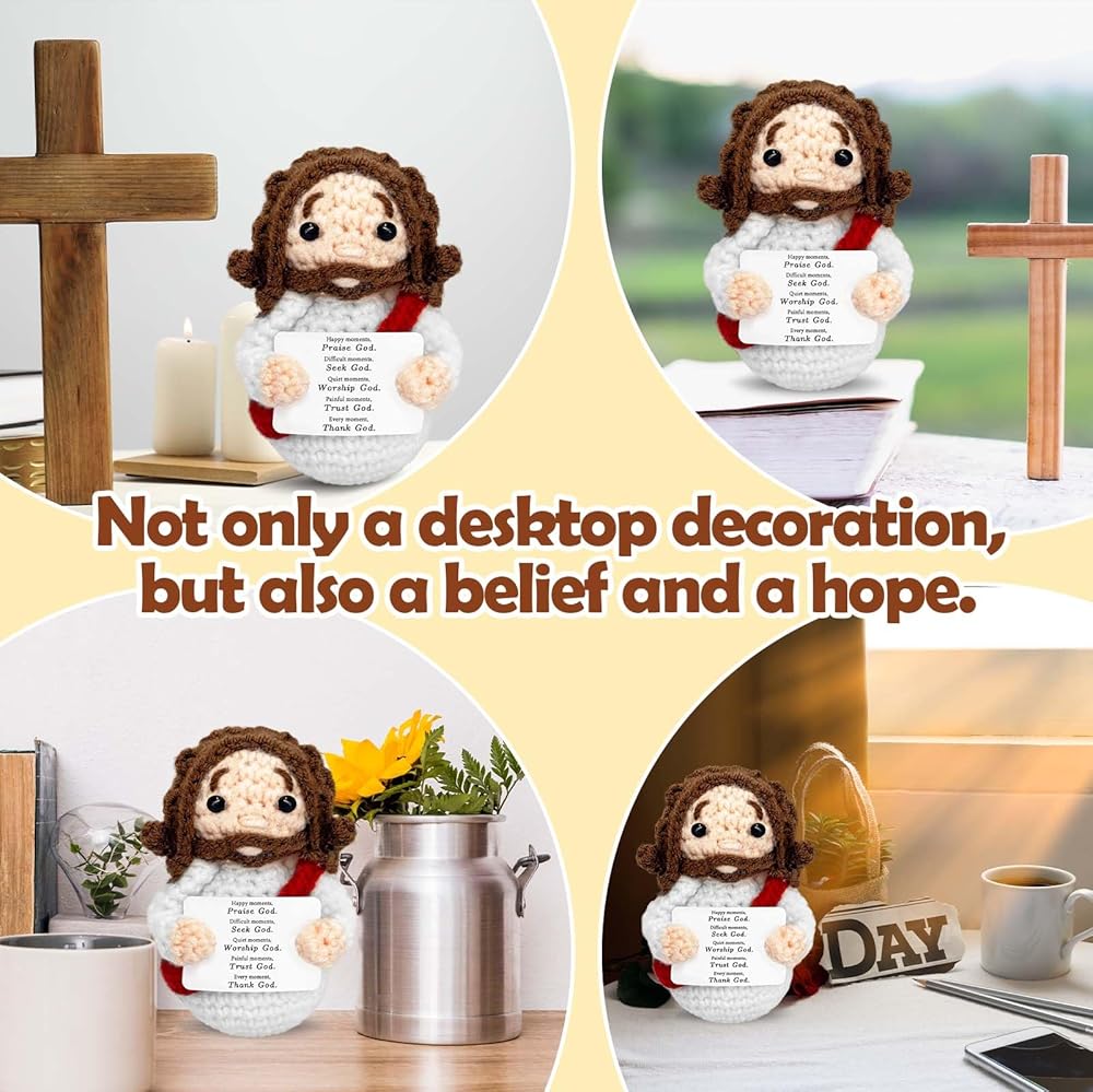【Handmade & Inspirational Jesus Plush Doll】Crafted with care, this 4.9” x 2.75” handmade crochet Jesus doll features soft wool yarn for a comforting touch. Each faith-based gift includes a Bible verse card, blending craftsmanship with spiritual inspiration. Perfect as a Jesus plush companion or little Jesus figure for daily encouragement