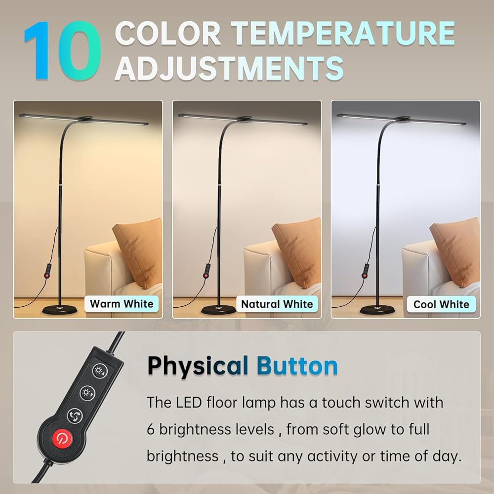 【إعدادات الضوء المشرقة والقابلة للتخصيص】 مدعوم بمحرك LED 24W وتوصيل ما يصل إلى 2400 لومن ، ويوفر مصباح الأرضية المزدوج 6 مستويات سطوع و 10 درجات حرارة ملونة (2700k-6500k)-لما مجموعه 60 مجموعة إضاءة. سواء كنت بحاجة إلى ضوء هش لصياغة نغمات دافئة للاسترخاء ، أو أي شيء بينهما ، فإن الإضاءة المثالية الخاصة بك هي مجرد قرص.