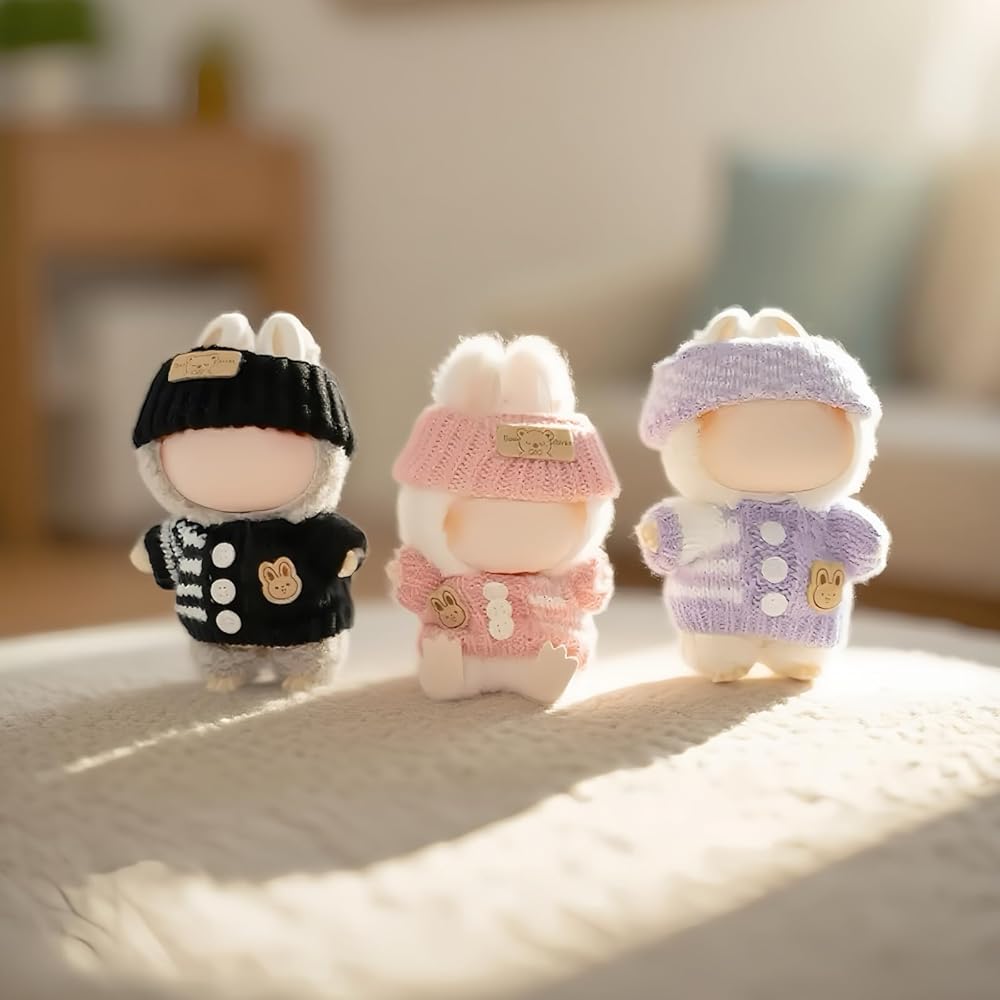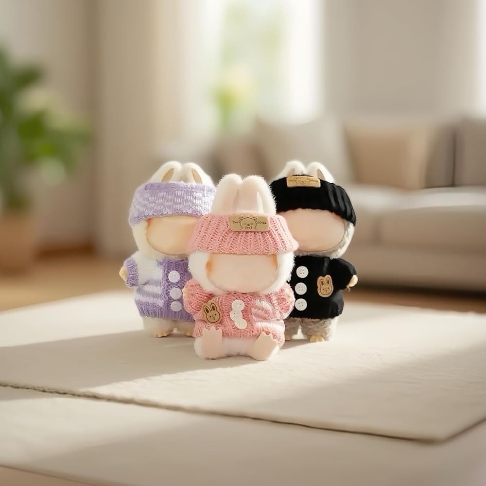 Cozy Knit Doll Sweater: Thick, textured knit doll sweaters feel soft yet durable. Purple-white checkered hat shines in photos, suede bunny patches on sweaters and bear patches on hats add charm. They are perfect for display or play