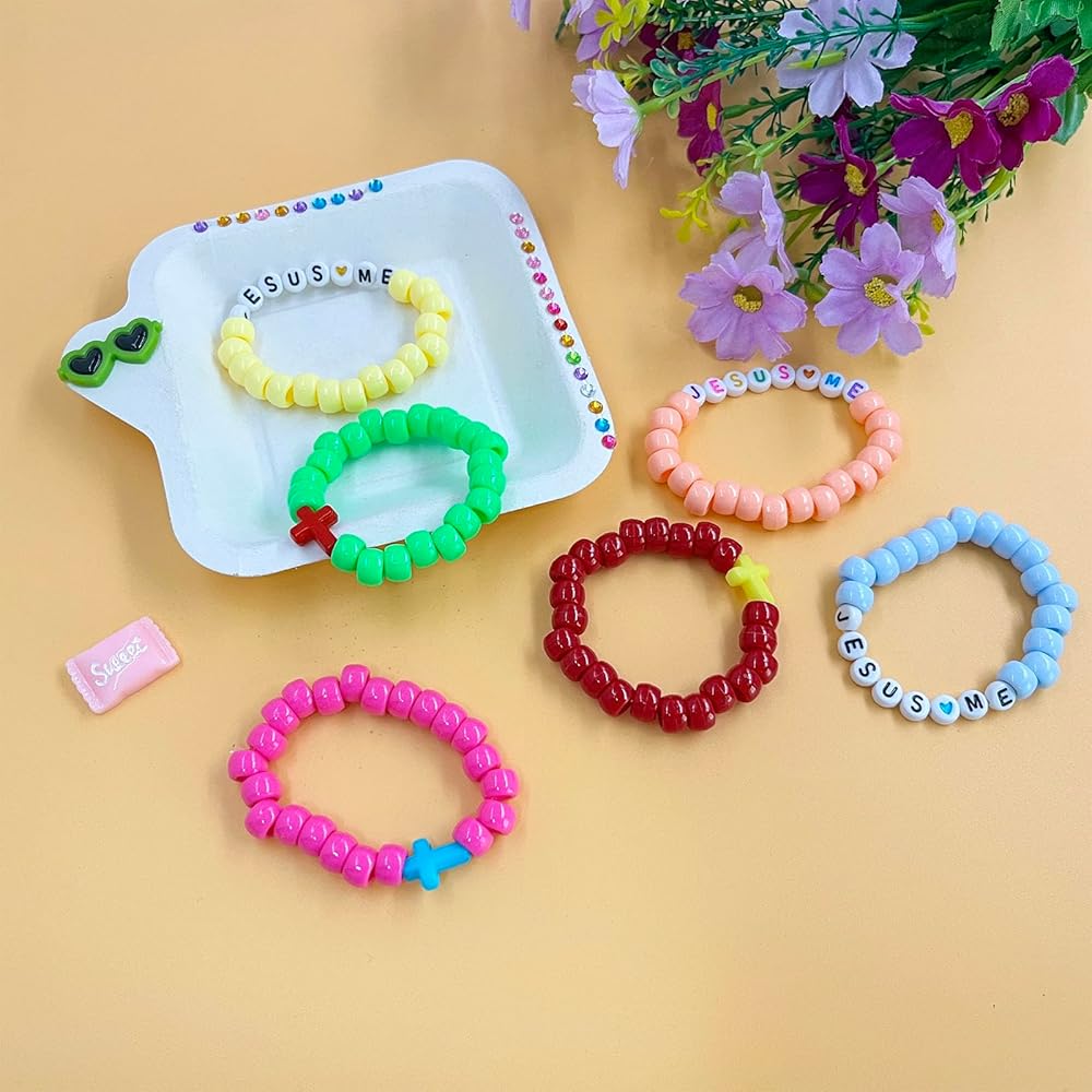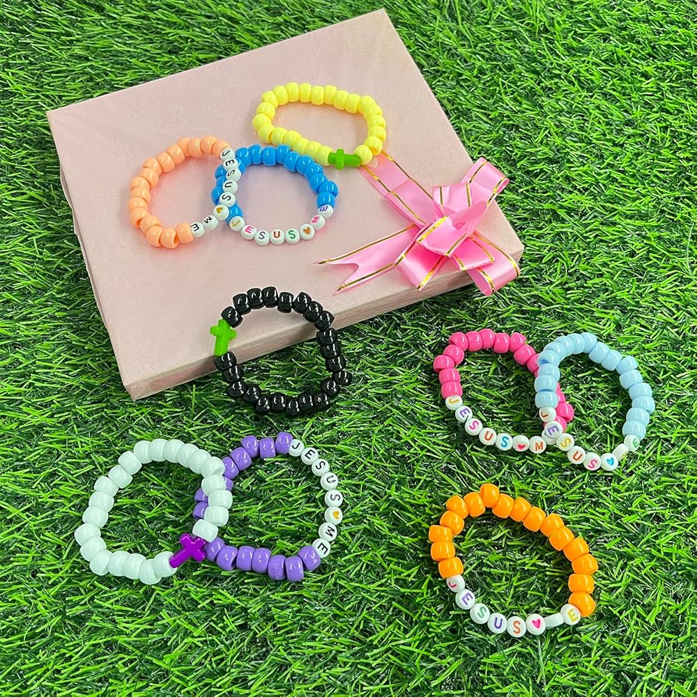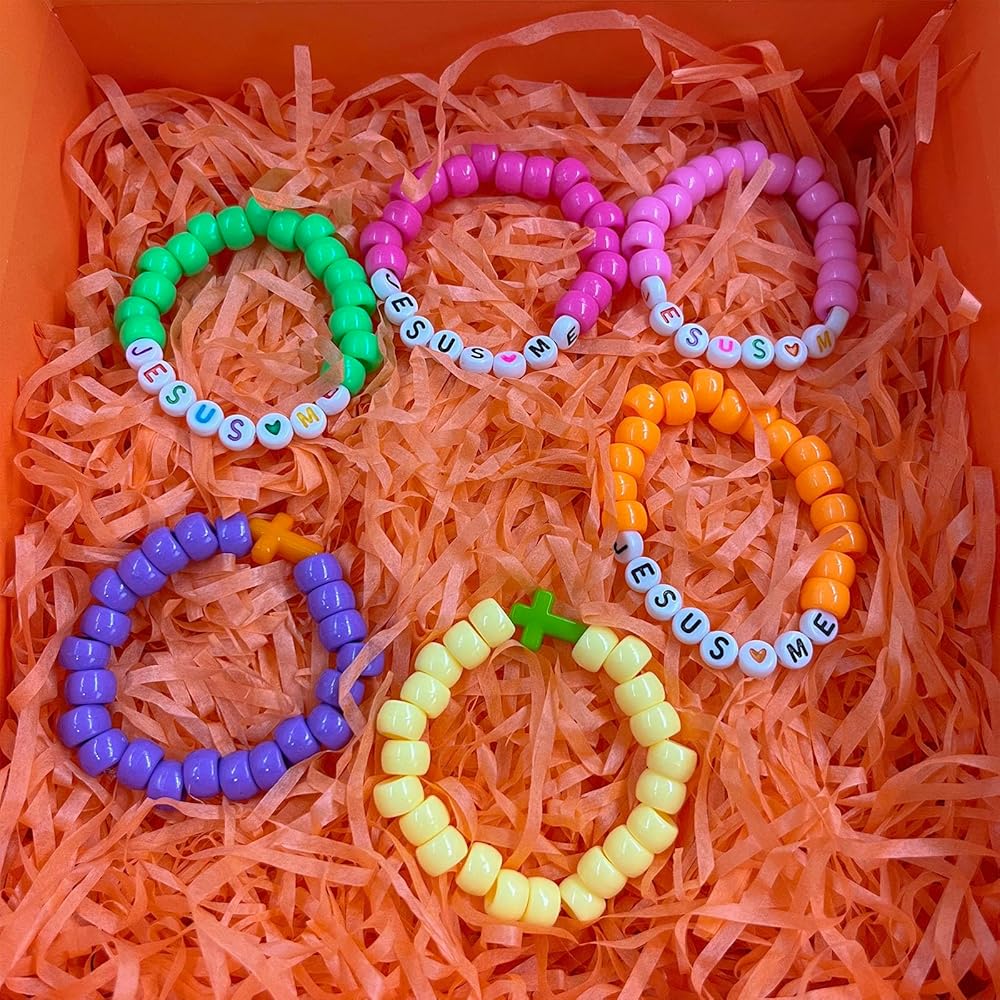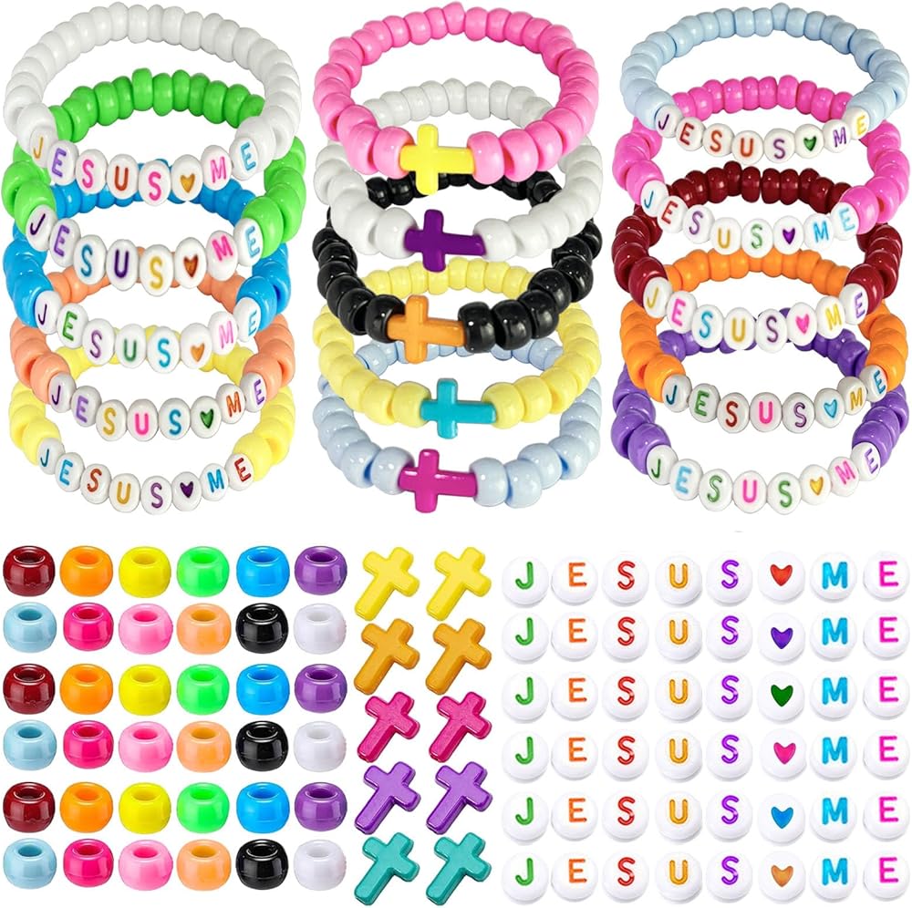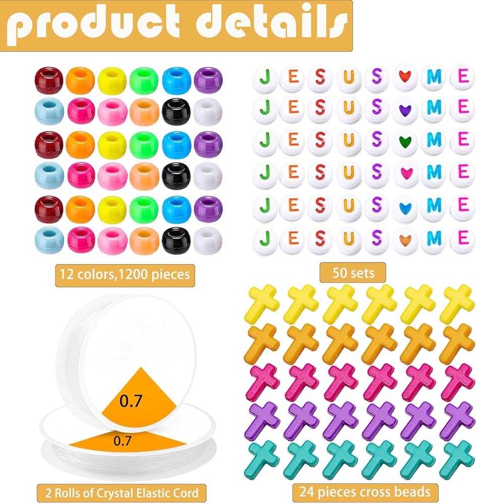 Includes 50 set leter beads enabling the creation of "Jesus" and "Me", 50 love beads, 100 gold filled beads,1200 multicolor beads and 30 cross beads