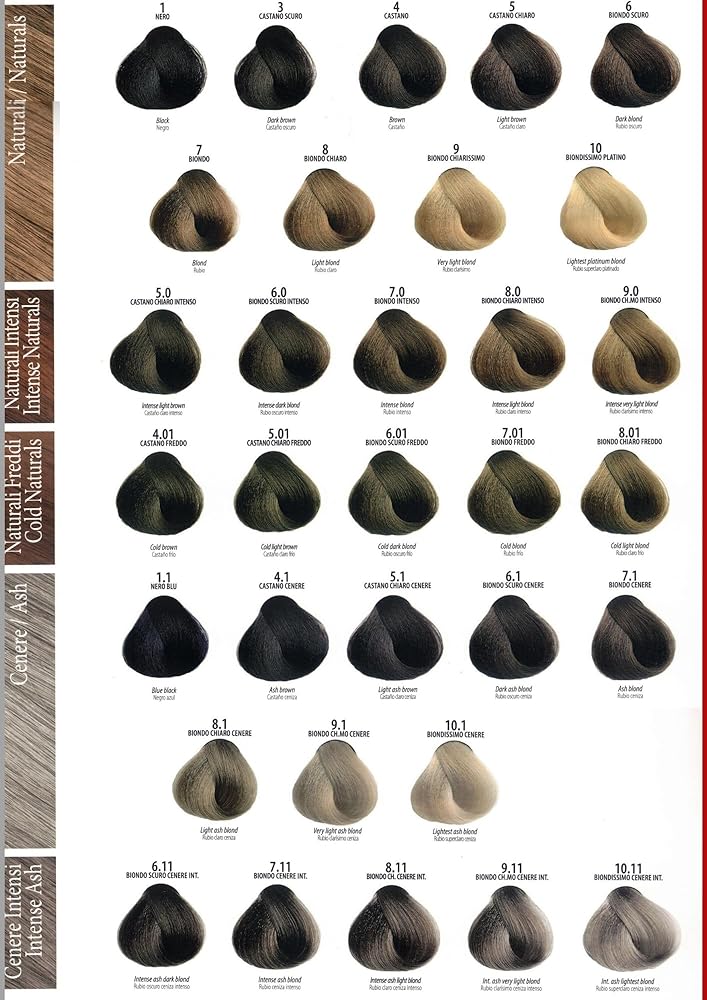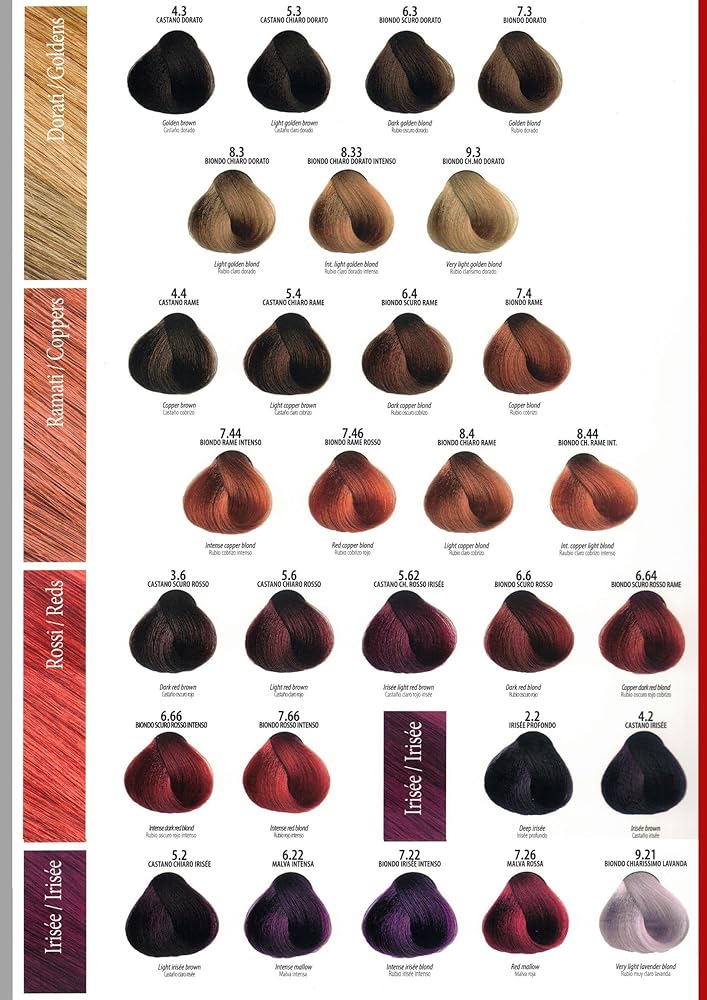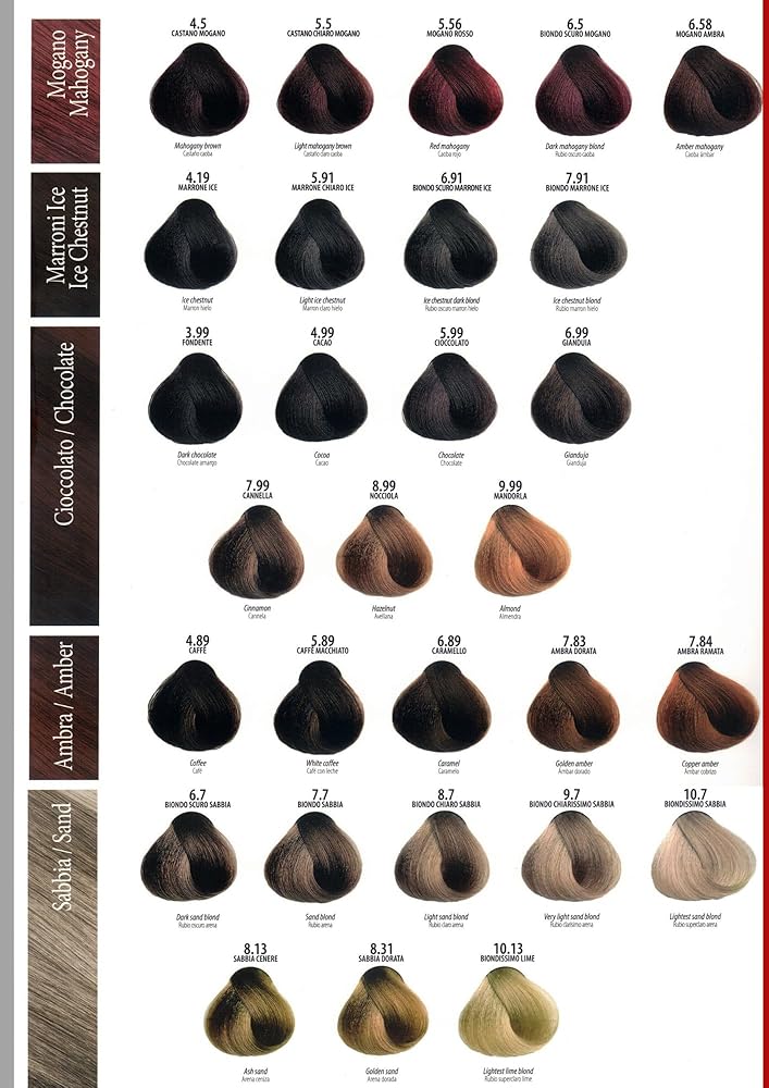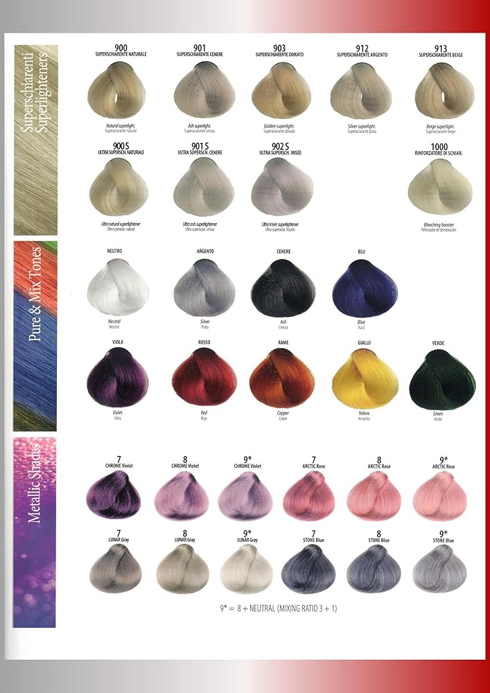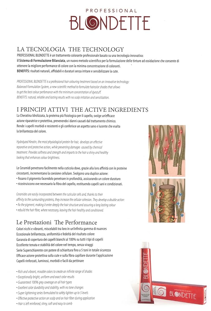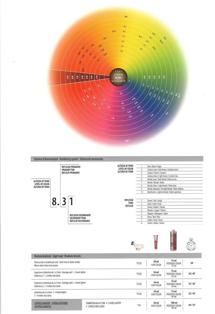 This chart is specific to the scale of colors on the Blondette brand, it gives you a sample of the colors on strands of hair, plus a graphic and a numeric system to check the amounts to use.