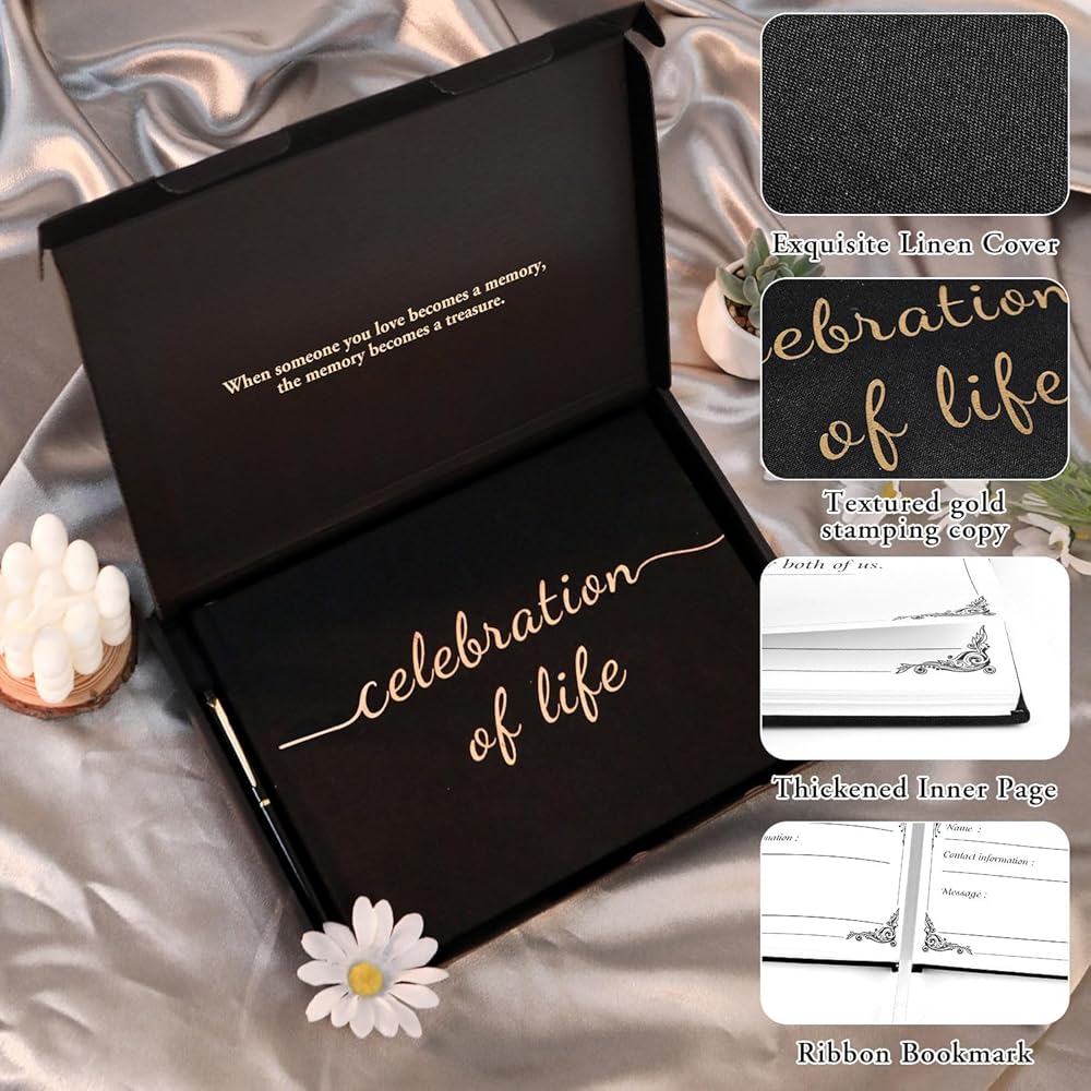 【عبوة أنيقة ورائعة】 مغطاة في صندوق هدايا أنيقة مع شارة "احتفال الحياة" ذات الذهب الذهب ، يتميز كتاب الذاكرة الخاص بنا من أجل الجنازة ، وهو ورقة خالية من الأحماض ، التي تقاوم الصفراء. هذا يضمن الحفاظ على ذكرياتك العزيزة كنوزات خالدة ، تستحق أن يتم نقلها عبر الأجيال