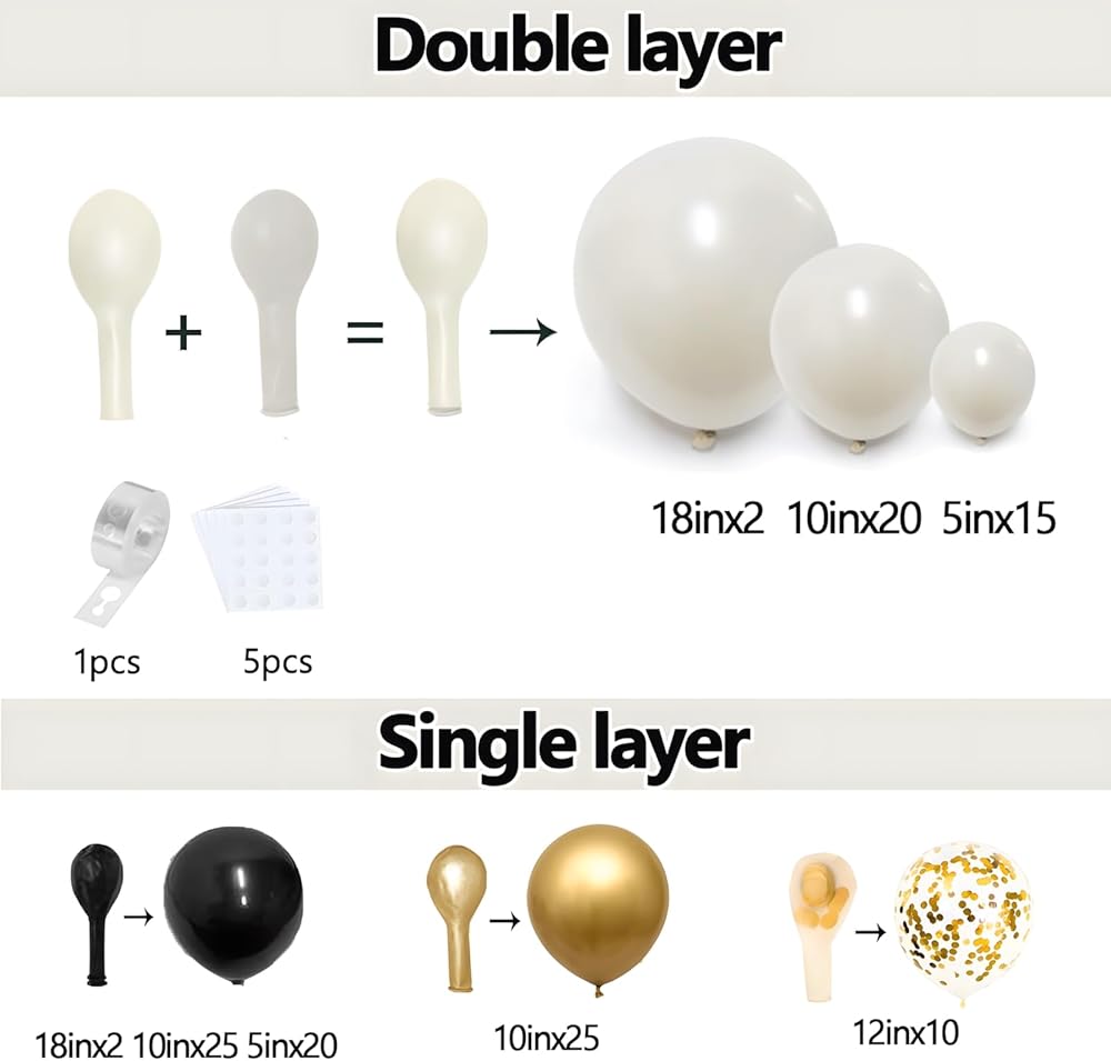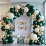 • 【Emerald Green Balloon Arch】: These Double stuffed emerald green balloons includes: double stuffed pearl sand white balloons 37pcs, double stuffed dark green and black balloons: 47pcs, chrome gold balloons 35pcs, and gold confetti balloons 10pcs, 1 roll of balloon strip tape, 5pcs balloon stickers.