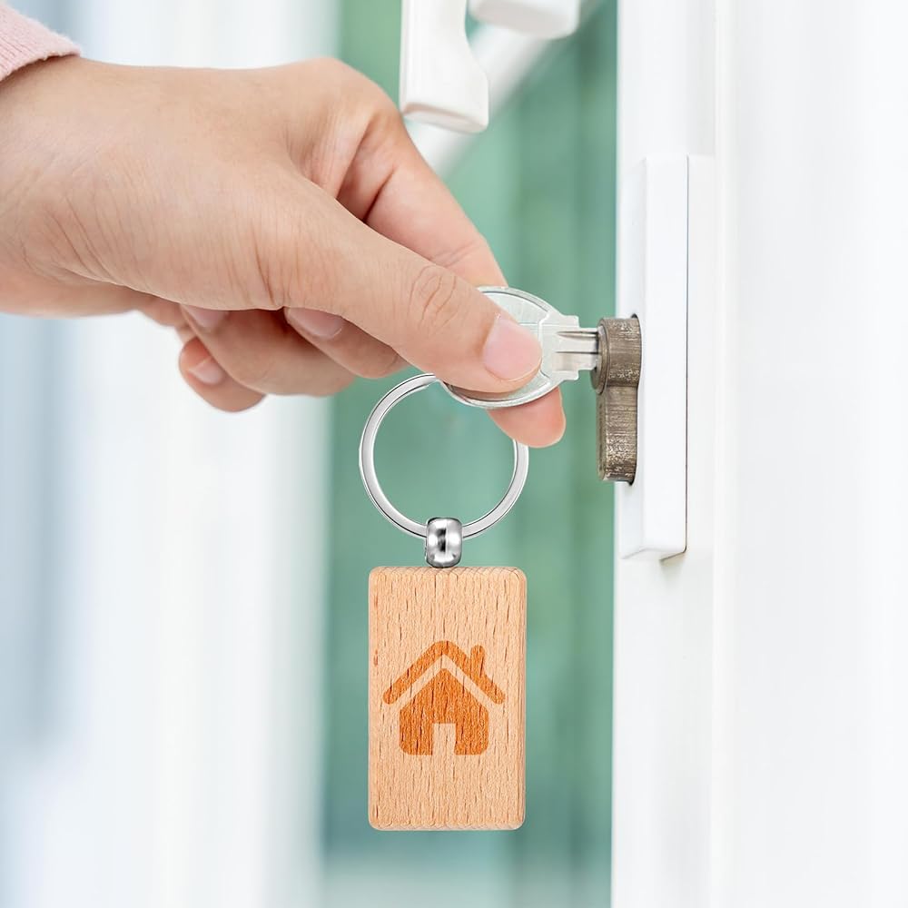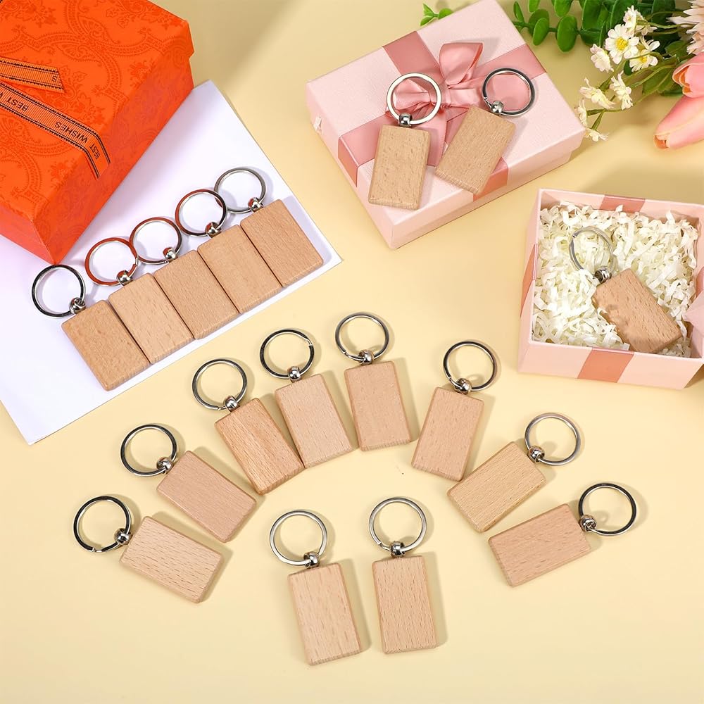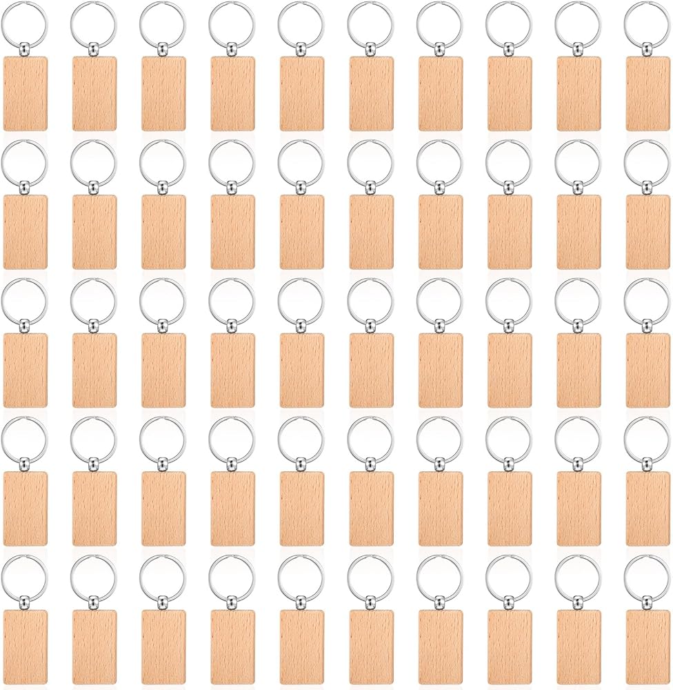 Dimeho Wooden Keychain Blanks, 50 Pcs Laser Engraving Wood Key Chain Rectangle Keychain Blank Bulk Wooden Key Ring Unfinished Various Key Tag for DIY Craft Supplies