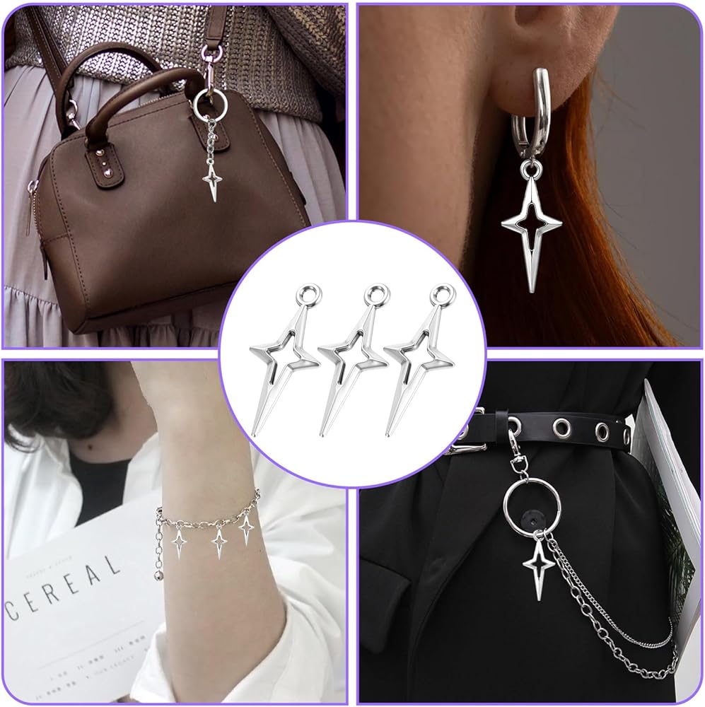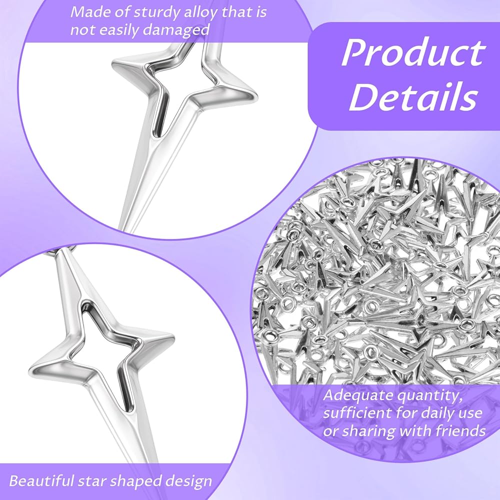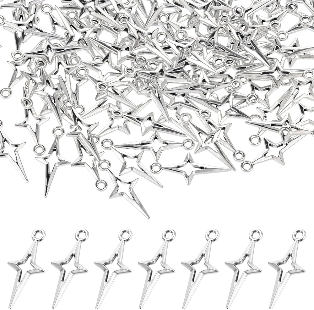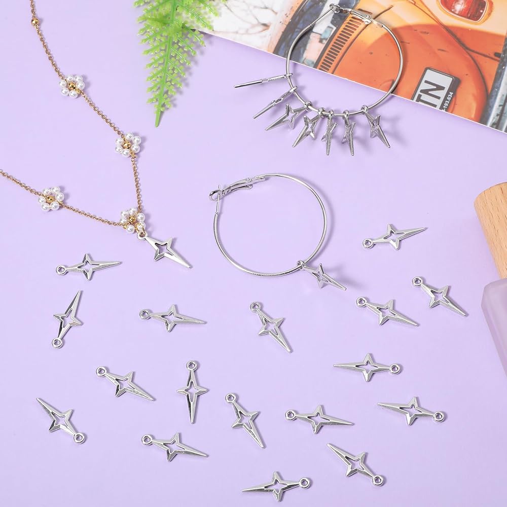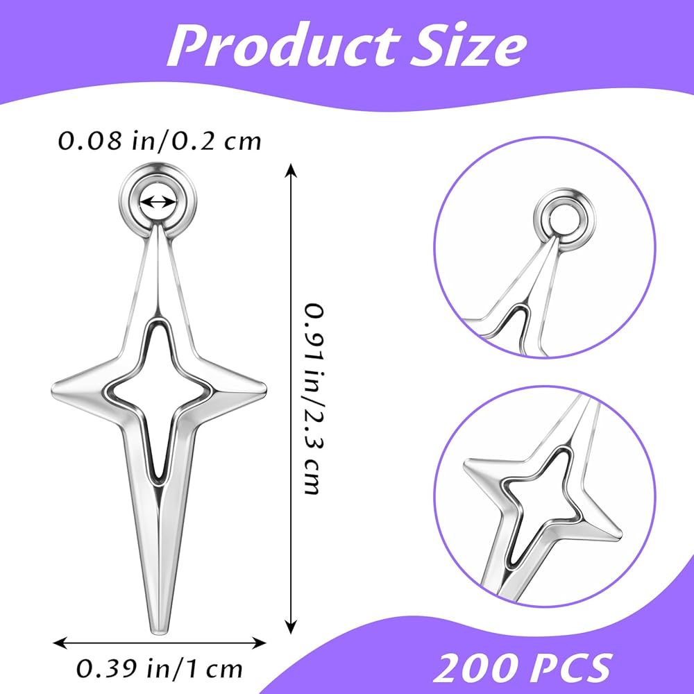Exquisite Silver Charms: These star charms for jewelry making feature an exquisite hollow four-pointed star design and measure 0.91 x 0.39 inches (2.3 x 1 cm). Perfect for use as earring charms, bracelet charms, and other DIY projects, these small charms add a touch of elegance to any creation. The 200-piece charm set is sufficient in quantity and is perfect for jewelry bracelet DIY creations.