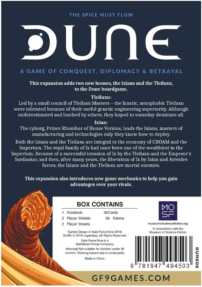 يضيف هذا التوسع منزلين جديدين هما Ixians و Tleilaxu إلى لعبة الكثبان الرملية. Tleilaxu: بقيادة مجلس صغير من Tleilaxu Masters - تم التسامح مع Tleilaxu المتعصبين والمعادين للأجانب بسبب تفوقهم في الهندسة الوراثية المفيدة. على الرغم من التقليل من شأن الآخرين وكرههم، إلا أنهم كانوا يأملون في أن يهيمنوا يومًا ما على كل شيء: سايبورغ، الأمير رومبور من هاوس فيرنيوس، يقود الإكسيان، أسياد التصنيع والتقنيات فقط أنهم يعرفون كيفية النشر. كل من الإكسيانيين وتليلاكسو جزء لا يتجزأ من اقتصاد تشوام والإمبريوم. كانت عائلة Ix الملكية ذات يوم واحدة من أغنى العائلة في امبريوم. بسبب الغزو الناجح لـ Ix من قبل Tleilaxu والإمبراطور ساردوكار، وبعد ذلك، بعد سنوات عديدة، تحرير Ix من قبل قوات Ixian و Atreides، فإن Ixians و Tleilaxu هم أعداء قاتلة. يقدم هذا التوسع أيضًا آليات ألعاب جديدة لمساعدتك على اكتساب مزايا على منافسيك.