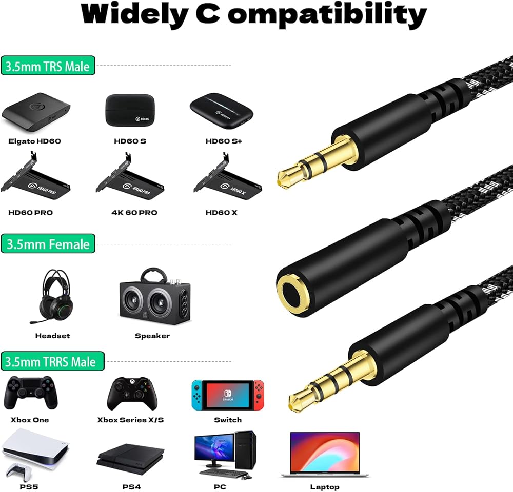 تعمل مع أجهزة Xbox One وXbox Series X/S وسويتش وبلاي ستيشن 5 وبلاي ستيشن 4 وأجهزة التحكم الأخرى؛ كما تستخدم لأجهزة الكمبيوتر واللاب توب وسماعات الألعاب والأجهزة الأخرى مقاس 3.5 ملم