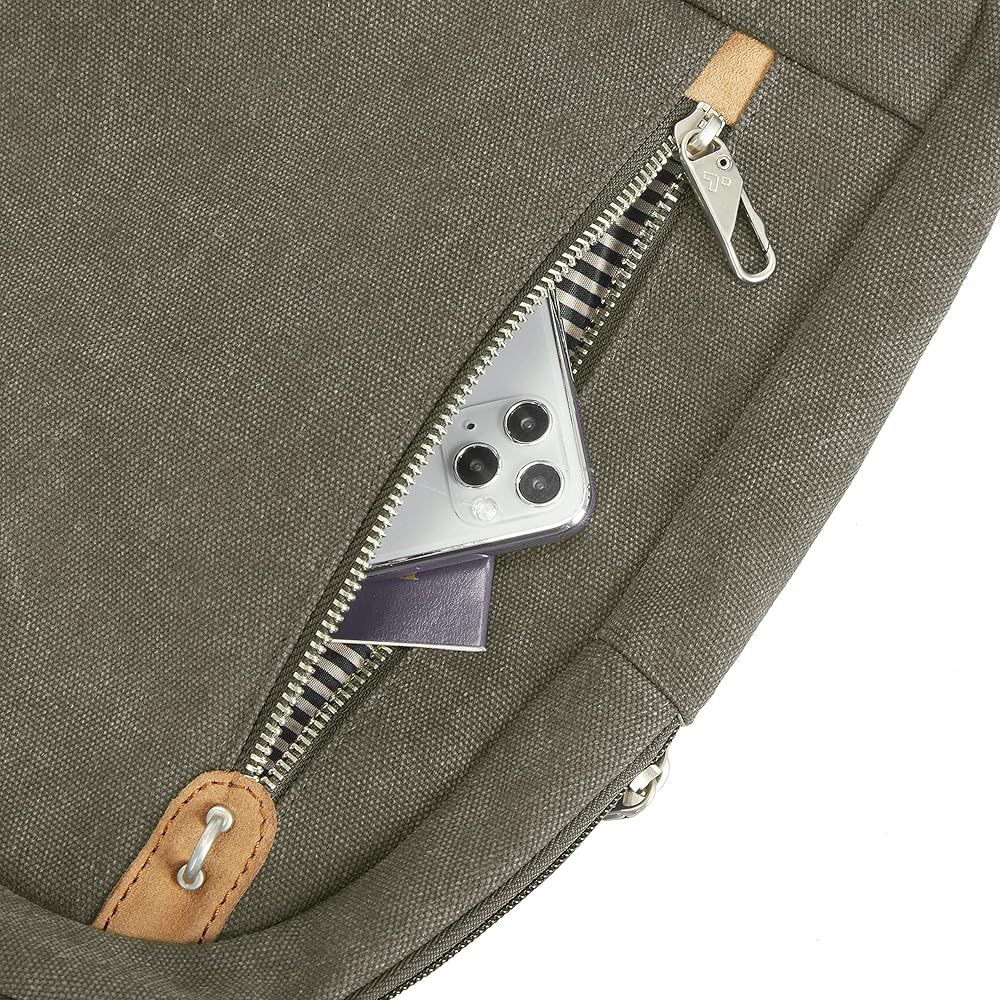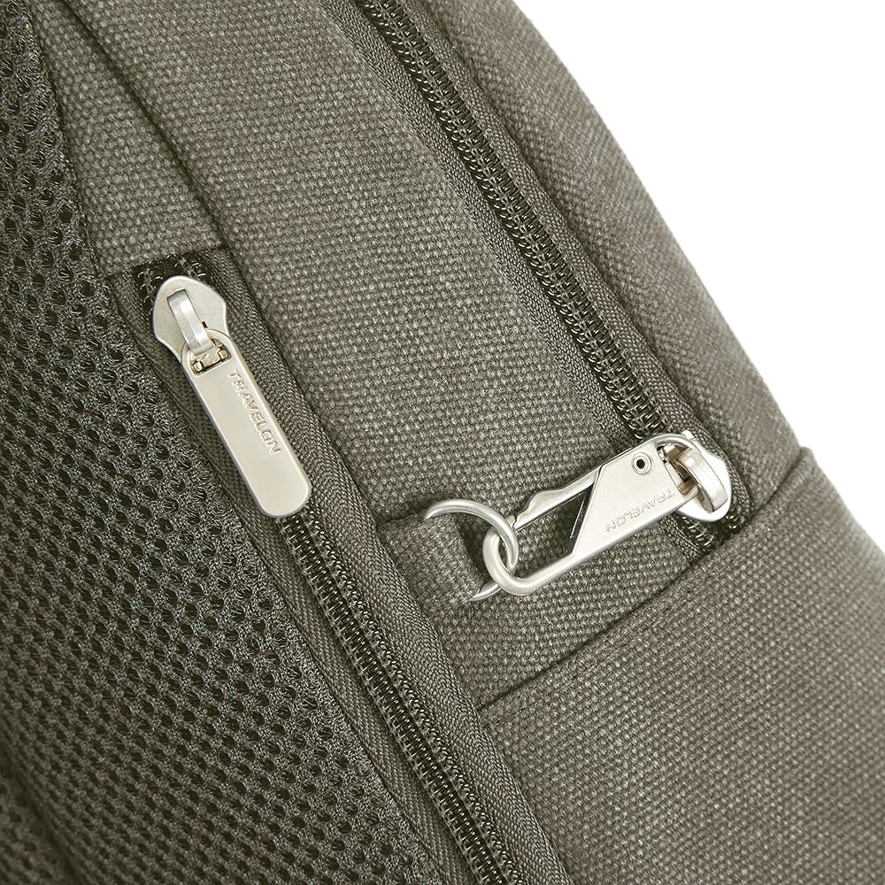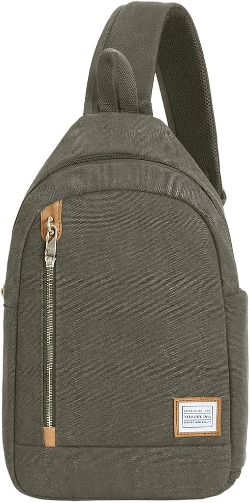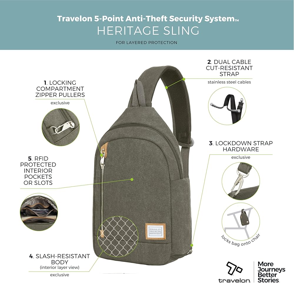 The Travelon Heritage Sling keeps getting better with age. Americana inspired with a modern twist, this quality-crafted bag is made from durable cotton canvas with a soft, worn touch, full-grain suede and matte nickel hardware only get better with age and a few good adventures. Thoughtfully organization for today's tech carry needs and comfortable to carry. Now you can stop watching your bag and look up to see the world in front of you. Our built-in 5-Point Anti-Theft security system will protect your valuables from pickpockets and thieves. Includes slash-resistant mesh barrier in front, sides and bottom body panels; slash-resistant strap; locking compartments; and RFID blocking organizer. Travelon packs your bag with peace of mind.