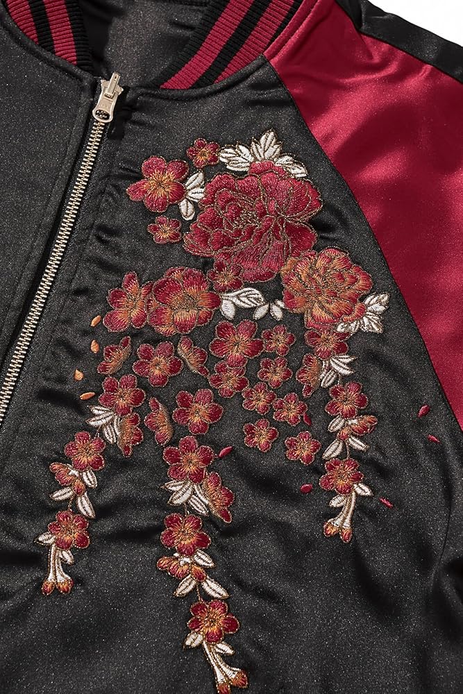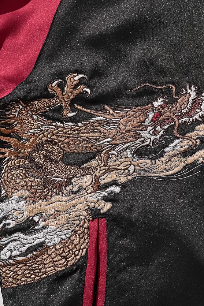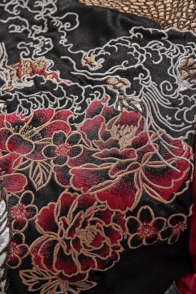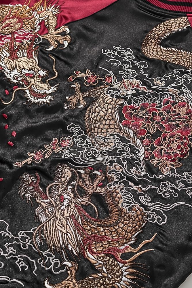 التطريز المذهل: يتميز الجزء الخلفي من سترة اسكواش بتصميم كبير مطرز للغاية. في نفس الوقت ، فإن هذه المطرزات لها معنى رمزي فريد. تنينات المطرزة على هذه السترة ترمز إلى الصدام والانصهار في الشرق والغربية ، بينما يرمز الفاوول الحمراء إلى الازدهار والهواء