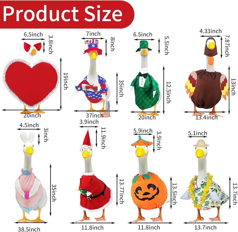 This yard goose clothing are carefully designed to fit approximately a 23 inch tall goose statue, the comfortable size of these outfits ensures a snug fit. Please note, the lawn goose is not included, you can freely use it with your existing statue or find a statue to your liking.