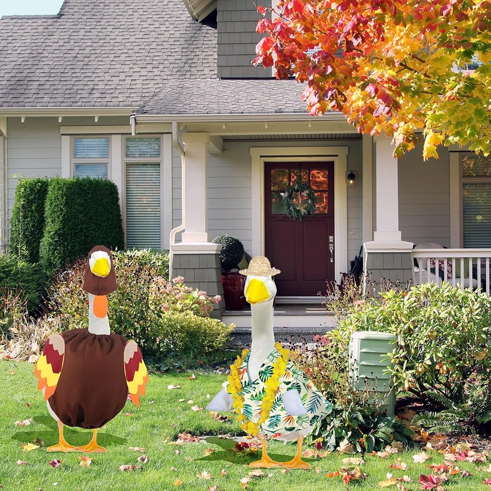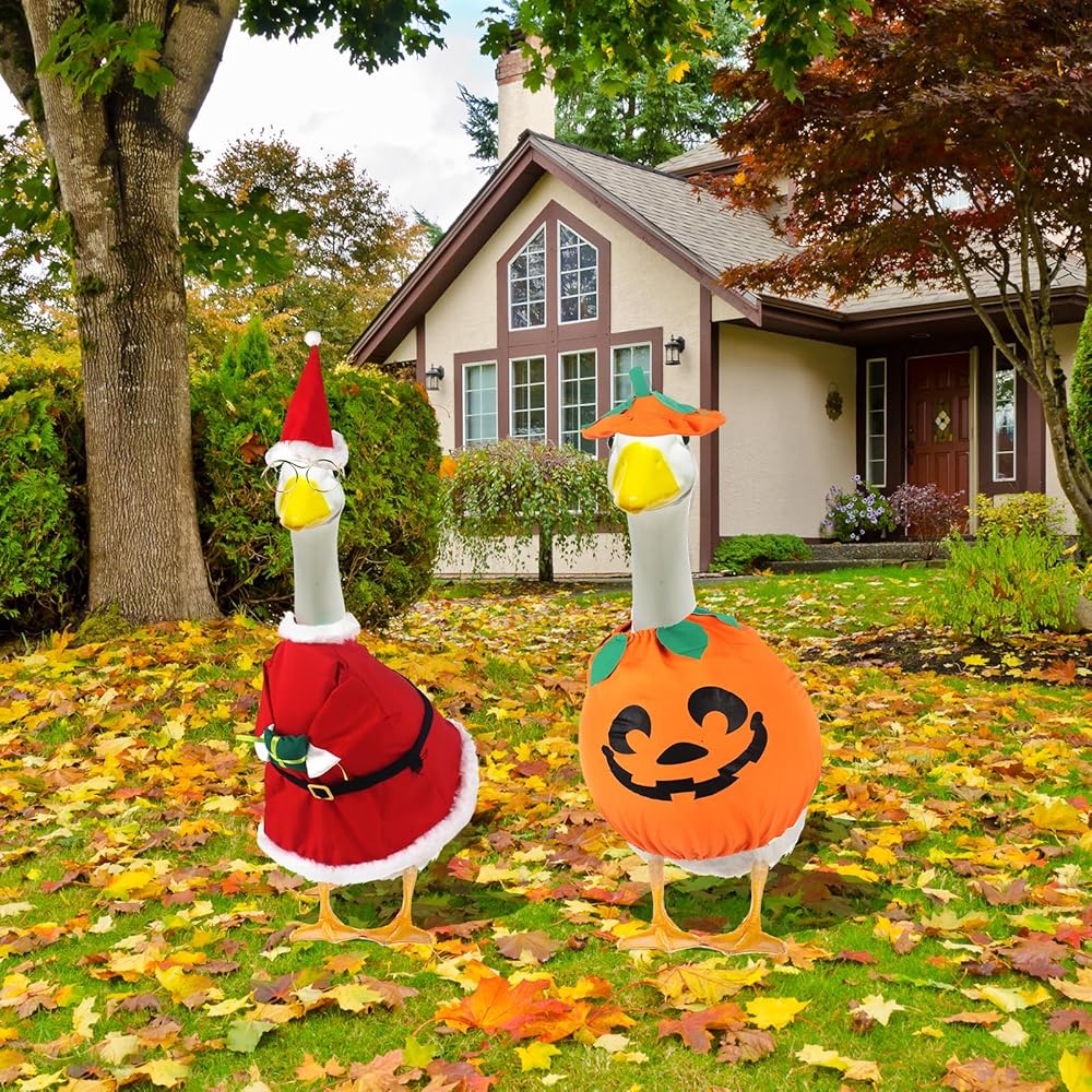 【Classic Design】This lawn goose outfits features classic design elements such as flag, rabbit, pumpkin, Christmas, Hawaiian lei and more. Each holiday matching decoration adds visually appealing details to your lawn or garden.