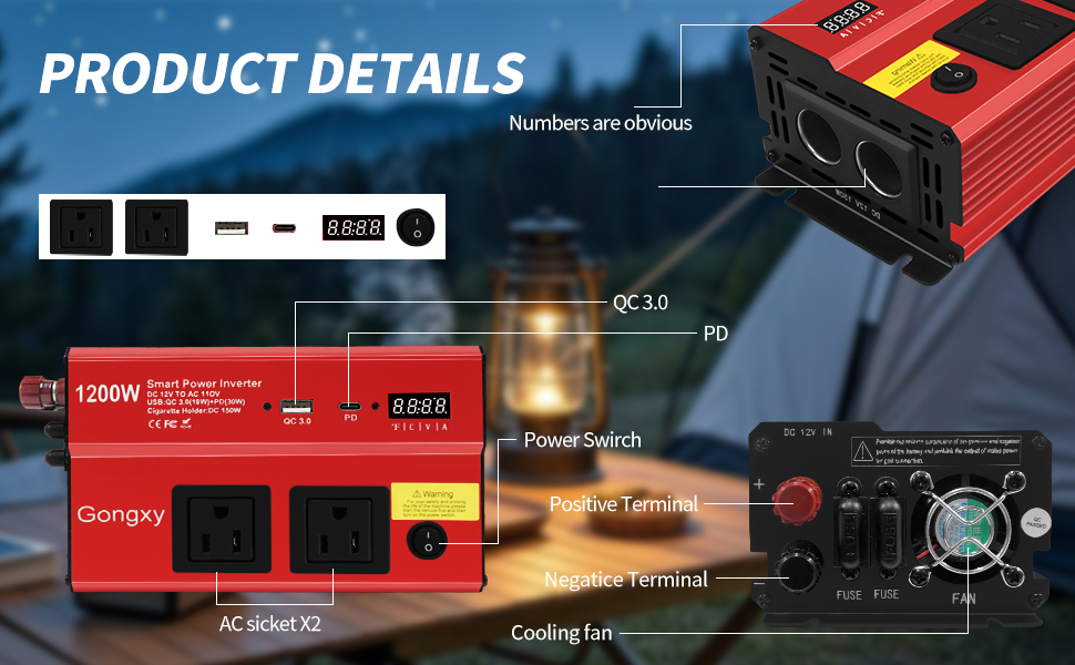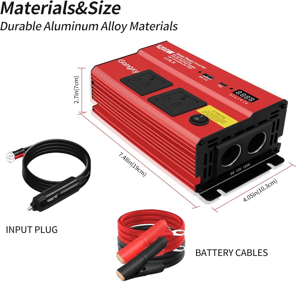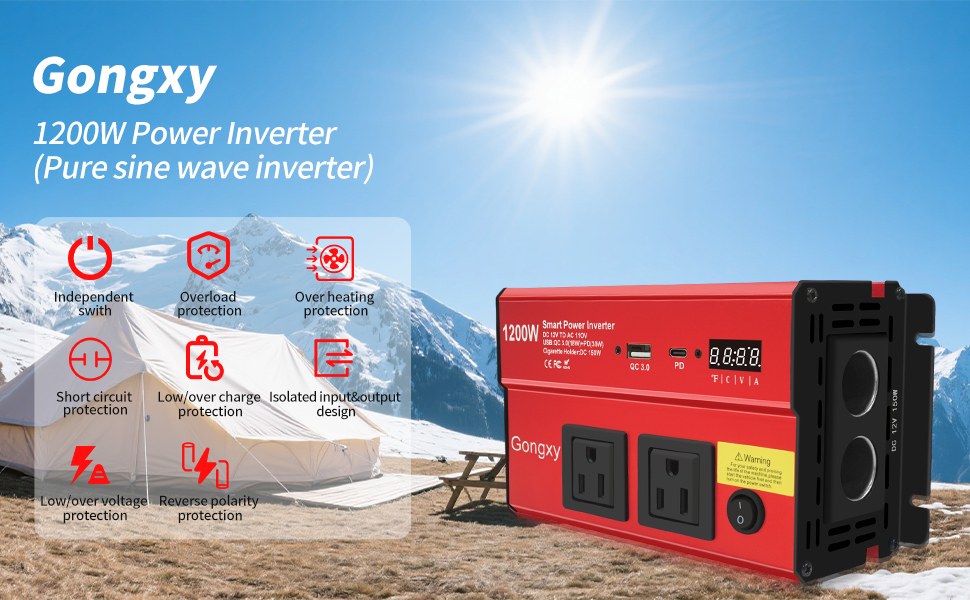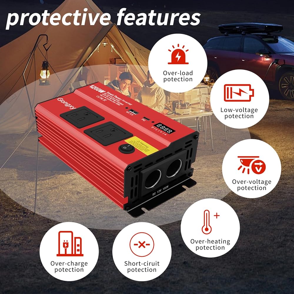 【العاكس من 12 فولت إلى 110 فولت】 يحول هذا العاكس 1200 واط بطارية 12 فولت DC لسيارتك إلى طاقة AC موثوقة ، ويوفر طاقة موجة جيبية مُعدلة 1200 واط (يرجى التأكد من أن الطاقة الإجمالية للأجهزة المتصلة أقل من أو تساوي 1200 واط). عاكس الطاقة مزود بعرض Smart LCD ، ومنافذ 2 × AC وميناء 2 من الأجهزة المتوافقة مع USB ، ولاعة سجائر السيارات (ما يصل إلى 150watt سعة الطفرة) ، وموانئ USB سريعة الشحن للشحن السريع.