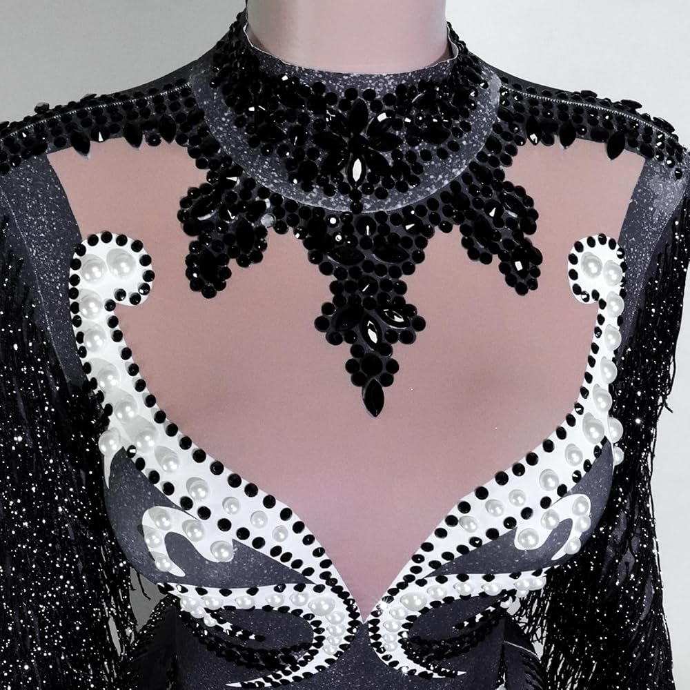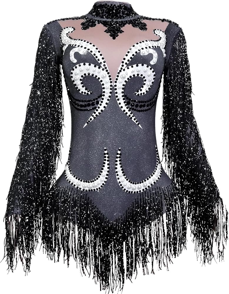 peculiarity:Sparkly Diamante Pearl High neck and long sleeves Fringe Bodysuit Available in multiple colors ;Black red purple blue grey and so many colors and styles.