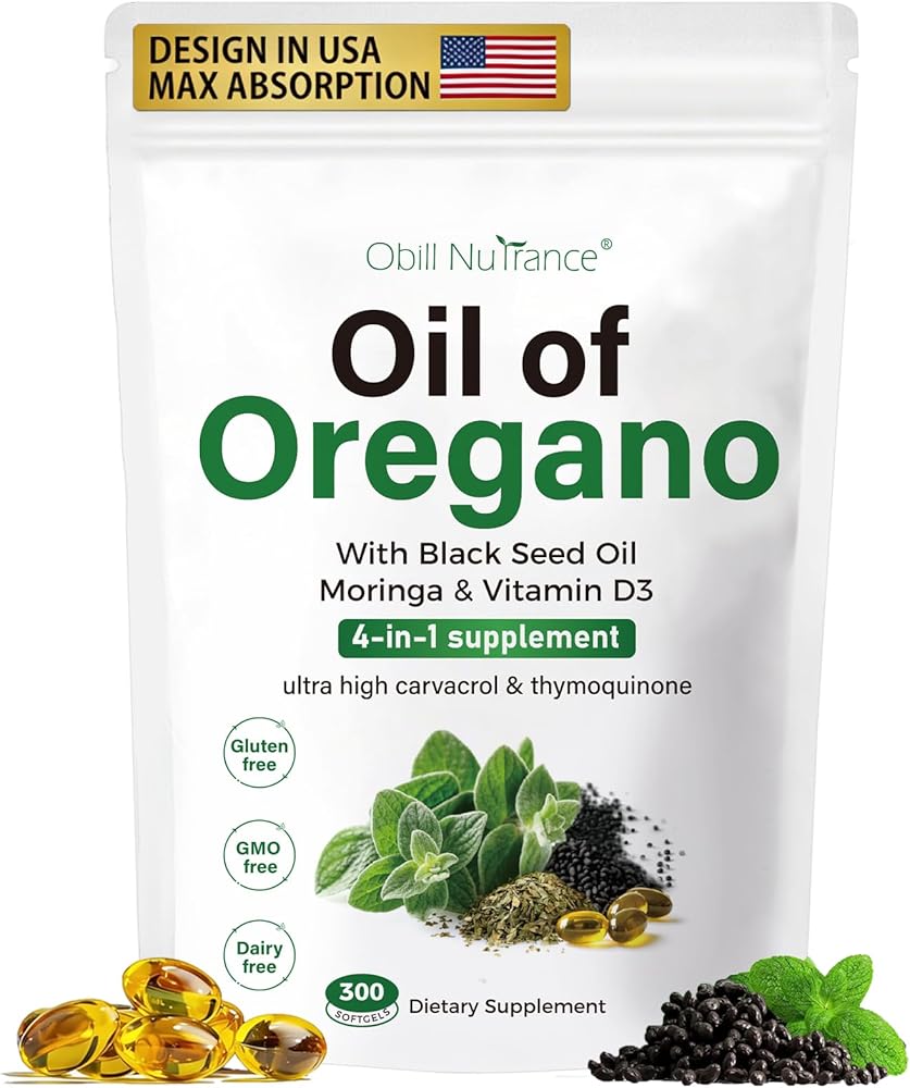 زيت كبسولات الأوريجانو ، زيت عضوي 4 في 1 من أوريجانو مع زيت البذور الأسود ، مورينغا وفيتامين D3 لدعم المناعة ، كارفكرول وثيموكينون ، غير المعدلة وراثيا ، 300 ناعمة-150 يوما إمداد