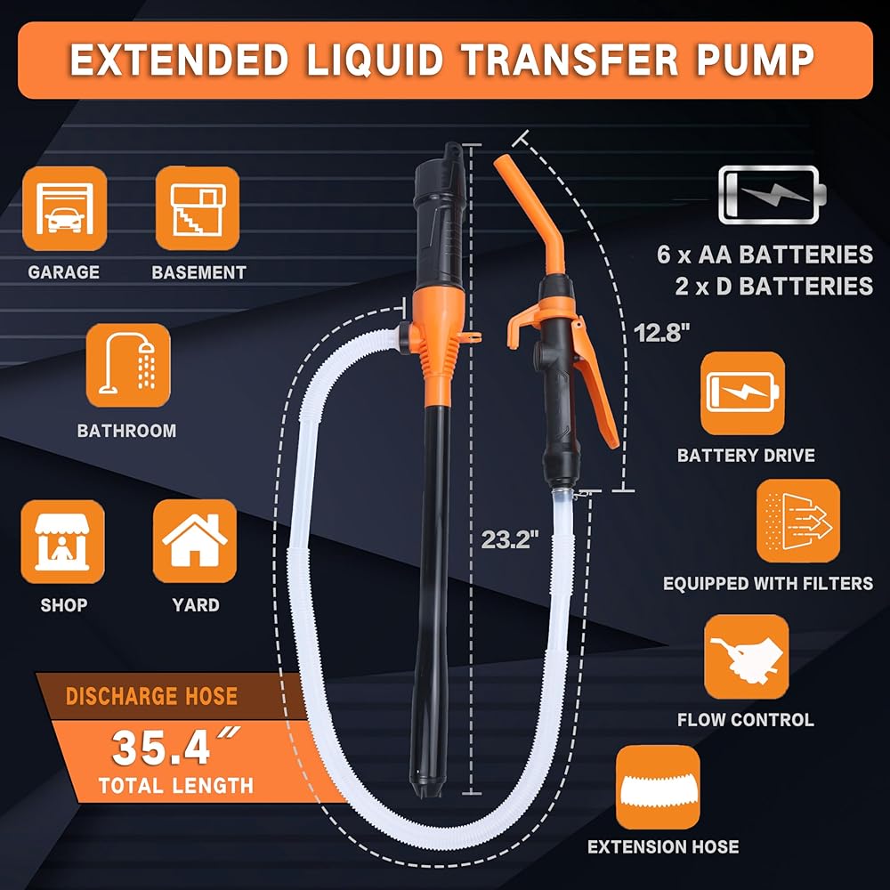 سهلة التشغيل: المضخة تعمل بالطاقة البطارية ، مما يضمن نقل السوائل الآمن والسهل. أنابيبها 16 بوصة مناسبة لمجلدات 3 إلى 5 جالون ، مع خرطوم طوله 2 قدم وأنبوب شفط قطر 1 بوصة