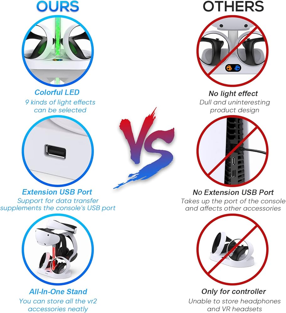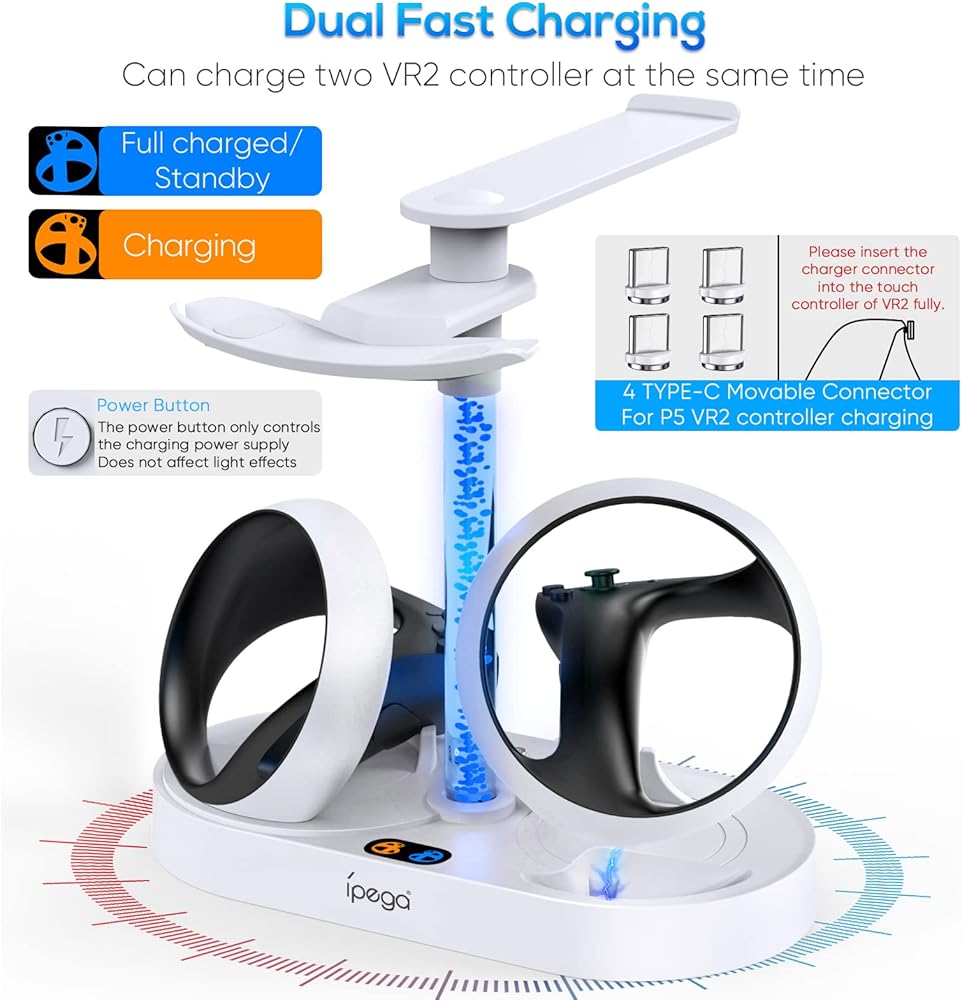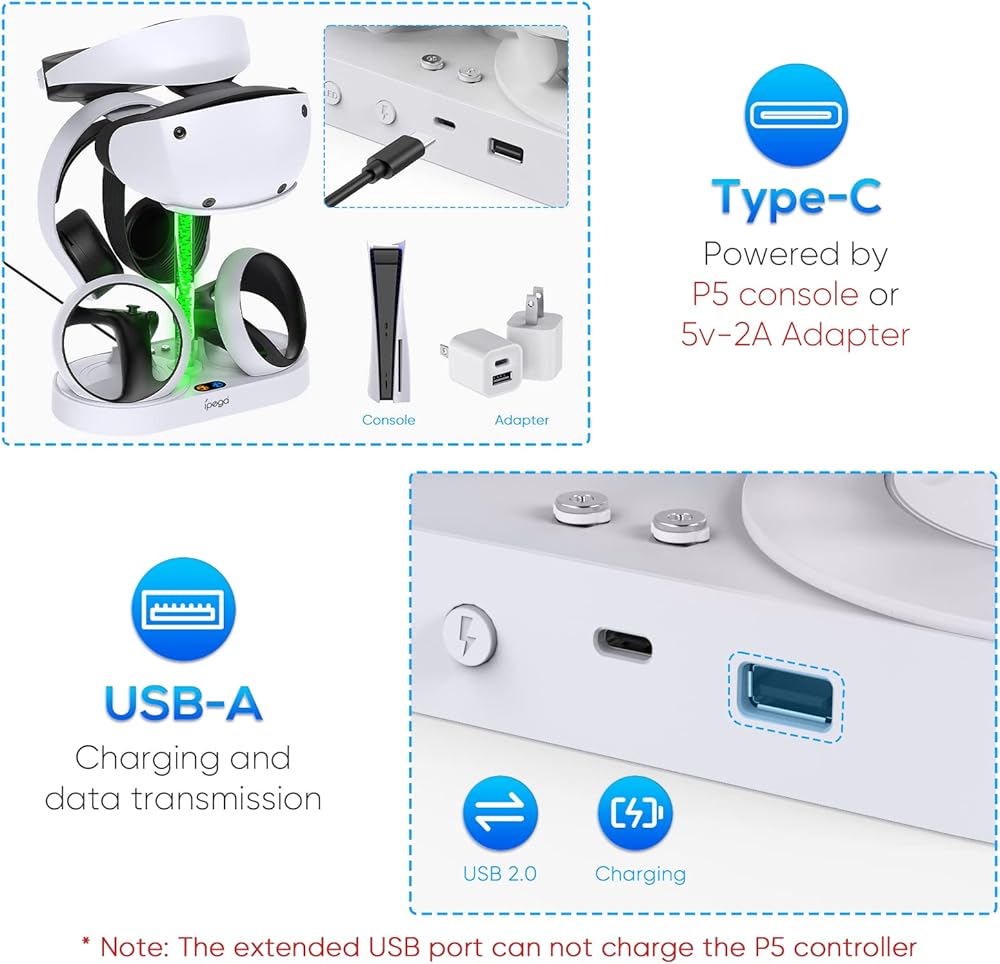 شاحن سريع لوحدة التحكم PSVR 2: يمكن لمحطة شحن وحدة التحكم هذه لجهاز PlayStation VR2 أن تدعم وحدتي تحكم PSVR 2 للشحن في وقت واحد، مدعومة بوحدة تحكم PS5/محول 2A من خلال كابل USB C متضمن. ملحوظة: منفذ USB C هو منفذ الإدخال، ولا يمكن لمنفذ USB الخاص بقاعدة شحن PSVR2 شحن وحدة تحكم PS5.