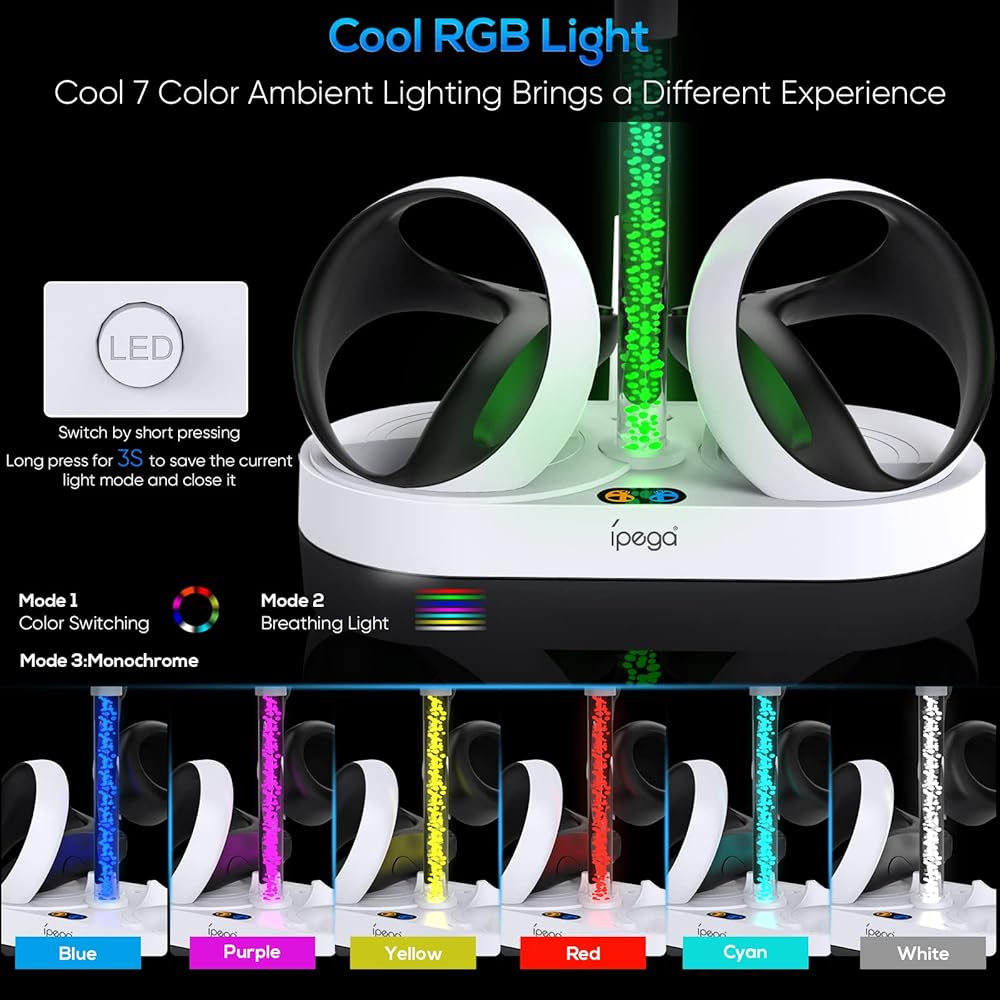 【مؤشر LED وشريط إضاءة RGB 】توفر مصابيح LED حالة الشحن لوحدات التحكم بالحواس. ضوء برتقالي أثناء الشحن، وضوء أزرق عند التشغيل والطاقة الكاملة. يحتوي شاحن PSVR2 أيضًا المزود بشريط إضاءة جوي على إجمالي 7 ألوان (الأحمر والأخضر والأزرق والأصفر والسماوي والأرجواني والأبيض). 3 أوضاع للاختيار من بينها، مما يجعلها لونًا فريدًا.