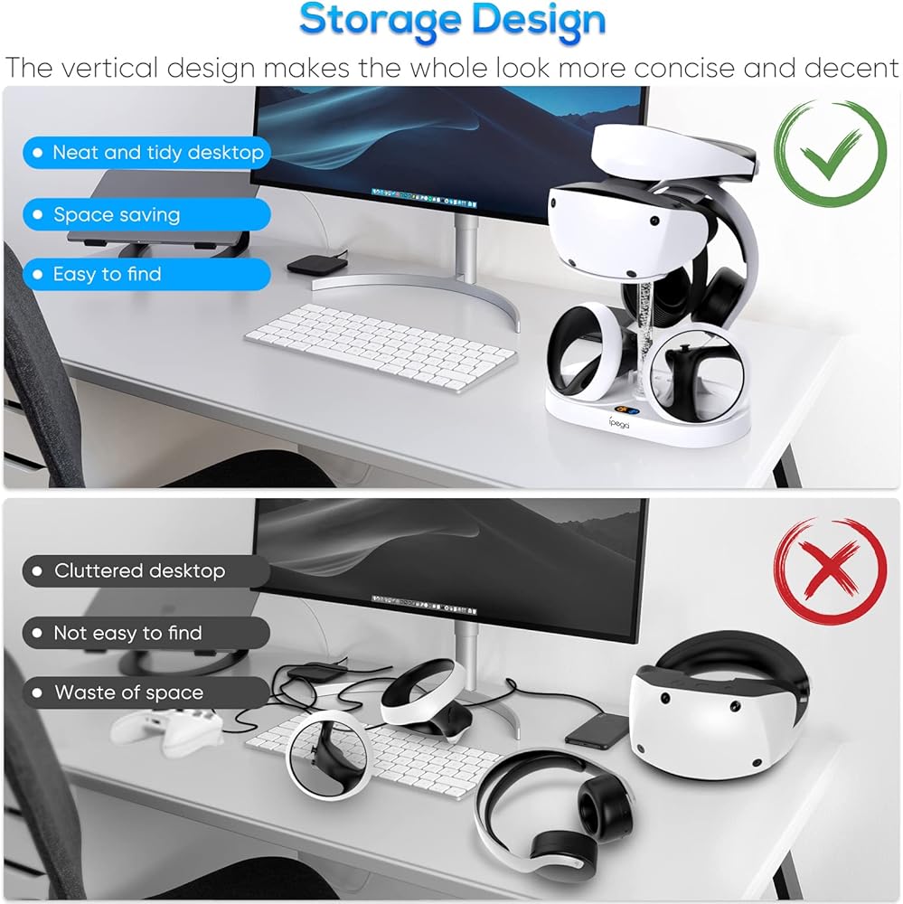 【حامل ومنظم شاحن وحدة التحكم】قاعدة الشحن لوحدات التحكم PSVR2 هي أيضًا حامل عرض لتخزين سماعات الرأس وأجهزة التحكم PSVR 2، وشحن وحدات التحكم المزدوجة وحل مشكلة سطح المكتب الفوضوي وفوضى الكابلات بالنسبة لك في نفس الوقت.