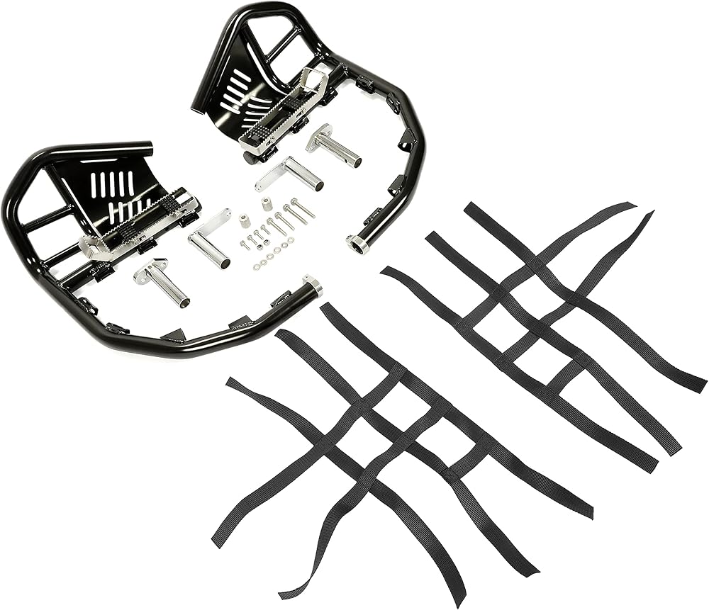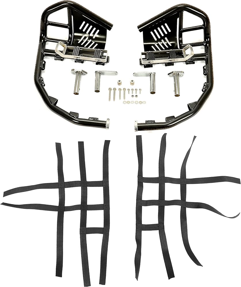 FITMENT - Compatible with 1999-2014 Honda 400EX 400X (Note: 08 and up 400X requires using the fender mount from the stock heel guard). Sold as a complete pair. Please check your vehicle before purchasing FEATURE - Color: Black Nerfs & Black Nets. The Nerf Bars Foot Pegs will protect your feet from flying debris, tire interference, and accidental snags while riding. Inner crisscross traction teeth reduce boot slippage and wear FUNCTION -Extra-wide stainless steel footpegs with a "kick-up" anti-slip edge provide more surface area than stock pegs HEAVY DUTY - The nerf bars are composed of heavy-duty and aluminum tubing (1-3/8" diameter) with chrome mounting hardware paired and adjustable widened pedals INSTALLATION - Instruction is included. The kit includes left and right bars, all mounts and hardware, and the colored nets