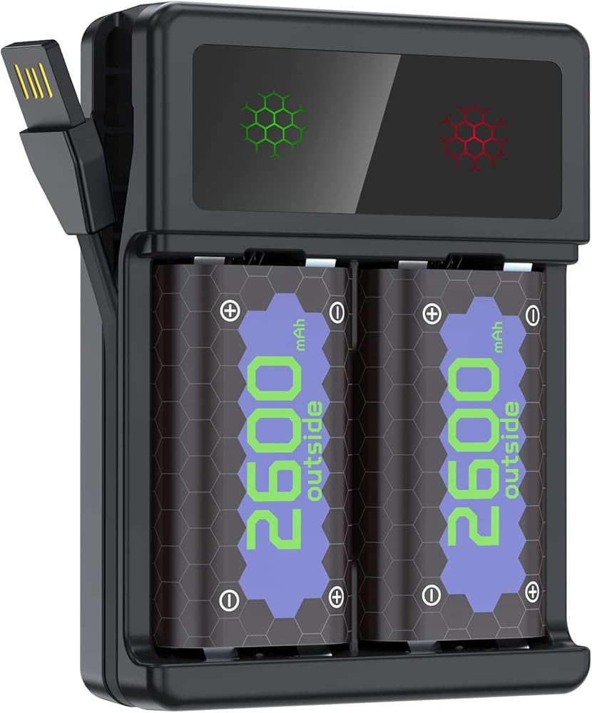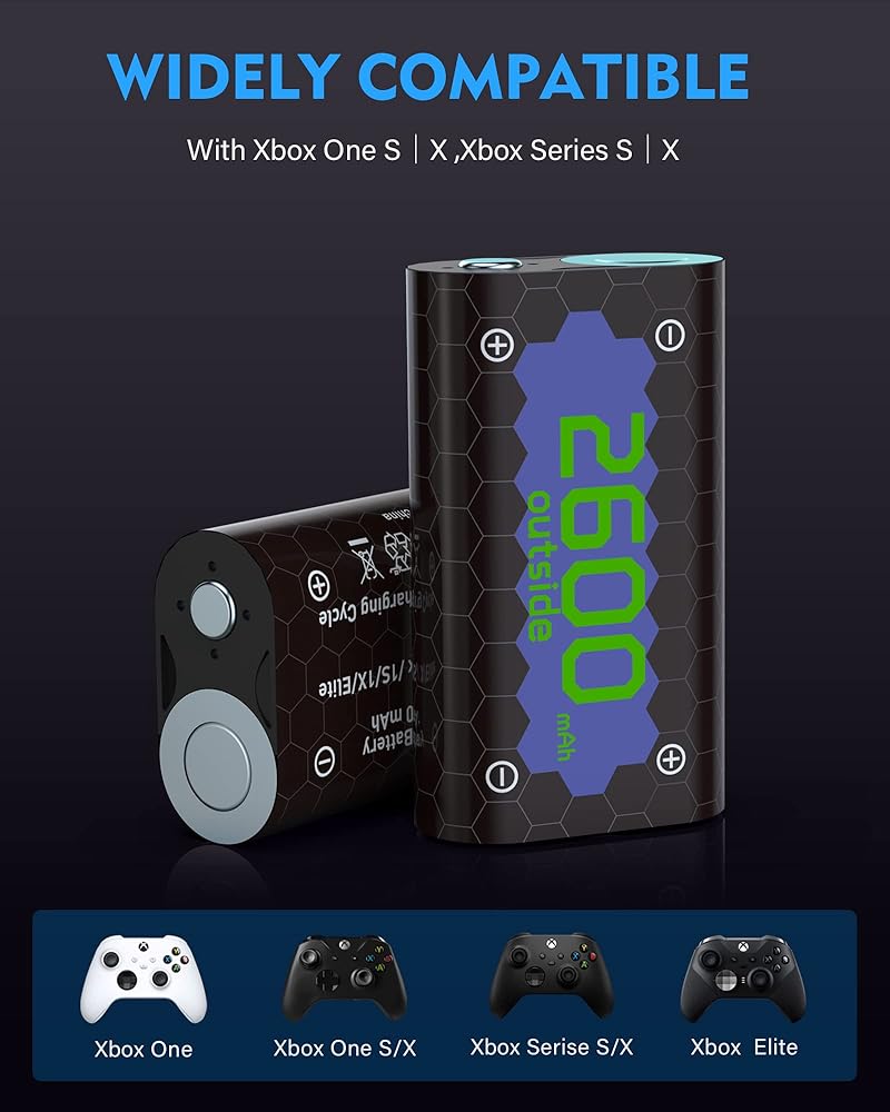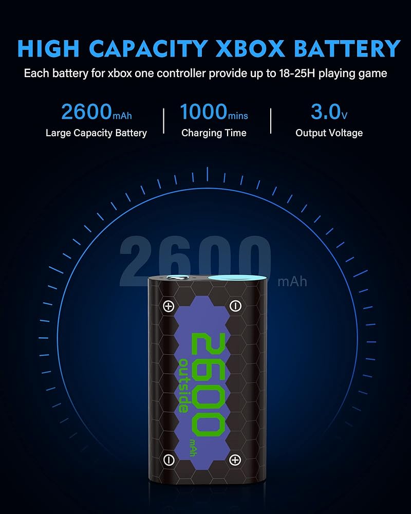حزمة بطارية قابلة لإعادة الشحن لأجهزة إكس بوكس عالية السعة: تأتي حزمة بطارية إكس بوكس ون القابلة لإعادة الشحن مع بطاريتين قابلتين لإعادة الشحن بقدرة 2600 مللي أمبير في الساعة لوحدة تحكم إكس بوكس ون، وبطاريتين قابلتين لإعادة الشحن مع شاحن توفر دائمًا طاقة كافية لأجهزة تحكم إكس بوكس ون/ إكس بوكس ون إس / إكس بوكس ون إكس/ إكس بوكس ون إيليت، لا داعي للقلق من الانقطاع في منتصف اللعبة