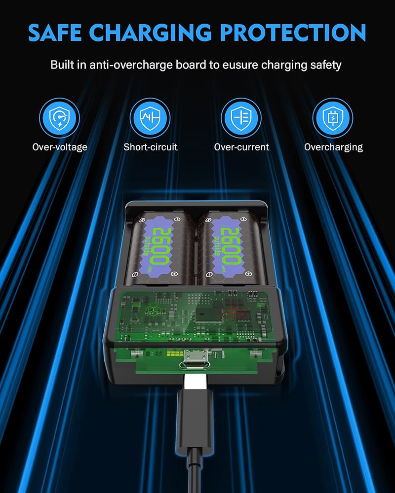 شحن آمن لمحطة شاحن بطارية Xbox One: شاحن البطارية هذا لحزمة بطاريات وحدة التحكم xbox series x يتميز بحماية سلامة الشحن الزائد والتيار الزائد والحرارة الزائدة والدائرة القصيرة لإطالة عمر البطارية وجعل كل بطارية قابلة لإعادة الشحن. ما يصل إلى 1000 مرة، يمنعك من الاضطرار إلى شراء المزيد من البطاريات لأجهزة التحكم xbox one/series x الخاصة بك والحماية من الشحن الزائد تضمن السلامة حتى عند الشحن طوال الليل.