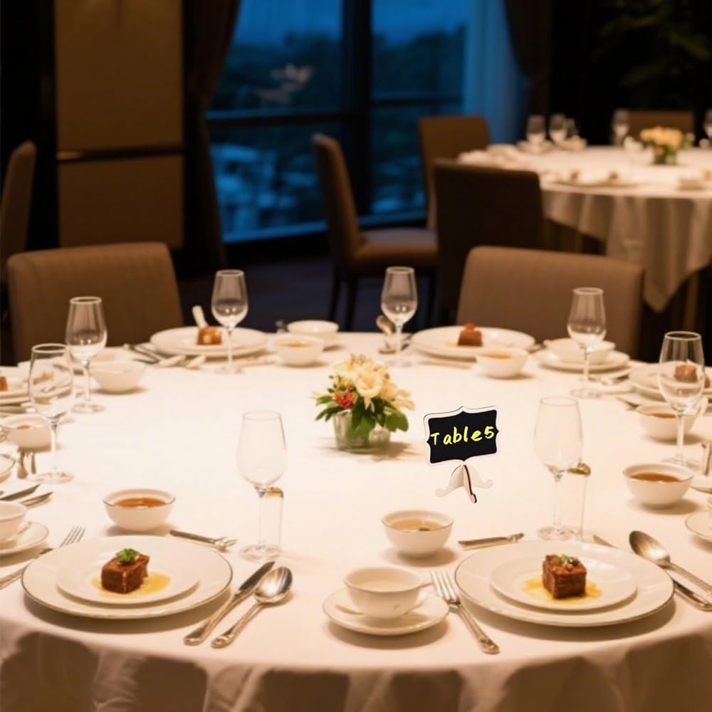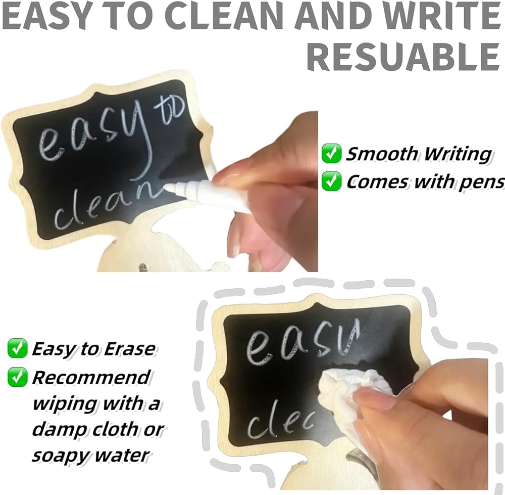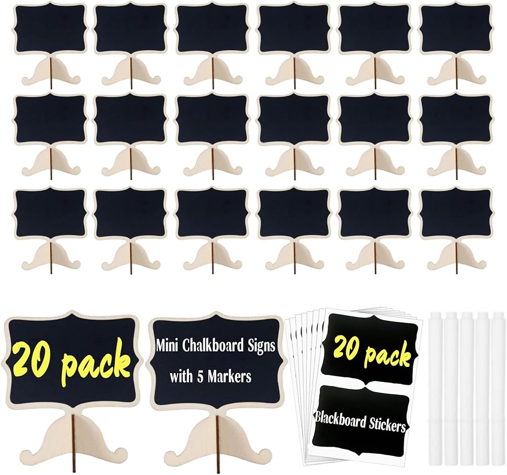 Add an elegant touch to your event presentation with these versatile mini chalkboard signs. Perfect for food labels at buffets, place cards at weddings, or price displays at retail shops, this 20-pack of small chalkboard signs comes complete with sturdy easel stands. Each sign provides a perfect writing surface for chalk or liquid chalk markers, making it easy to customize your message and wipe clean for reuse. The classic black background creates an appealing contrast that makes your text pop, while the compact size allows for convenient placement without taking up too much space. These professional-looking display signs are ideal for restaurants, parties, craft fairs, or any occasion requiring clear, attractive labeling. The durable construction ensures they'll stand up to repeated use, while their traditional design adds a charming rustic element to any setting. Whether you're organizing a wedding reception, birthday celebration, or business event, these versatile chalkboard signs help create clear, stylish organization.