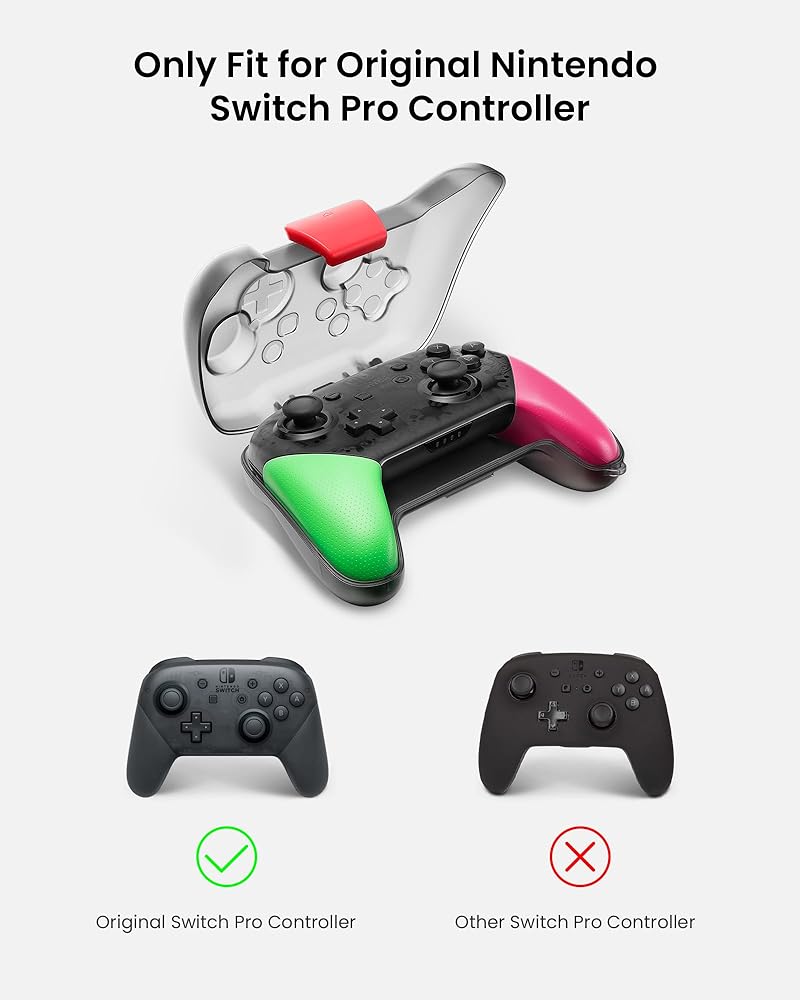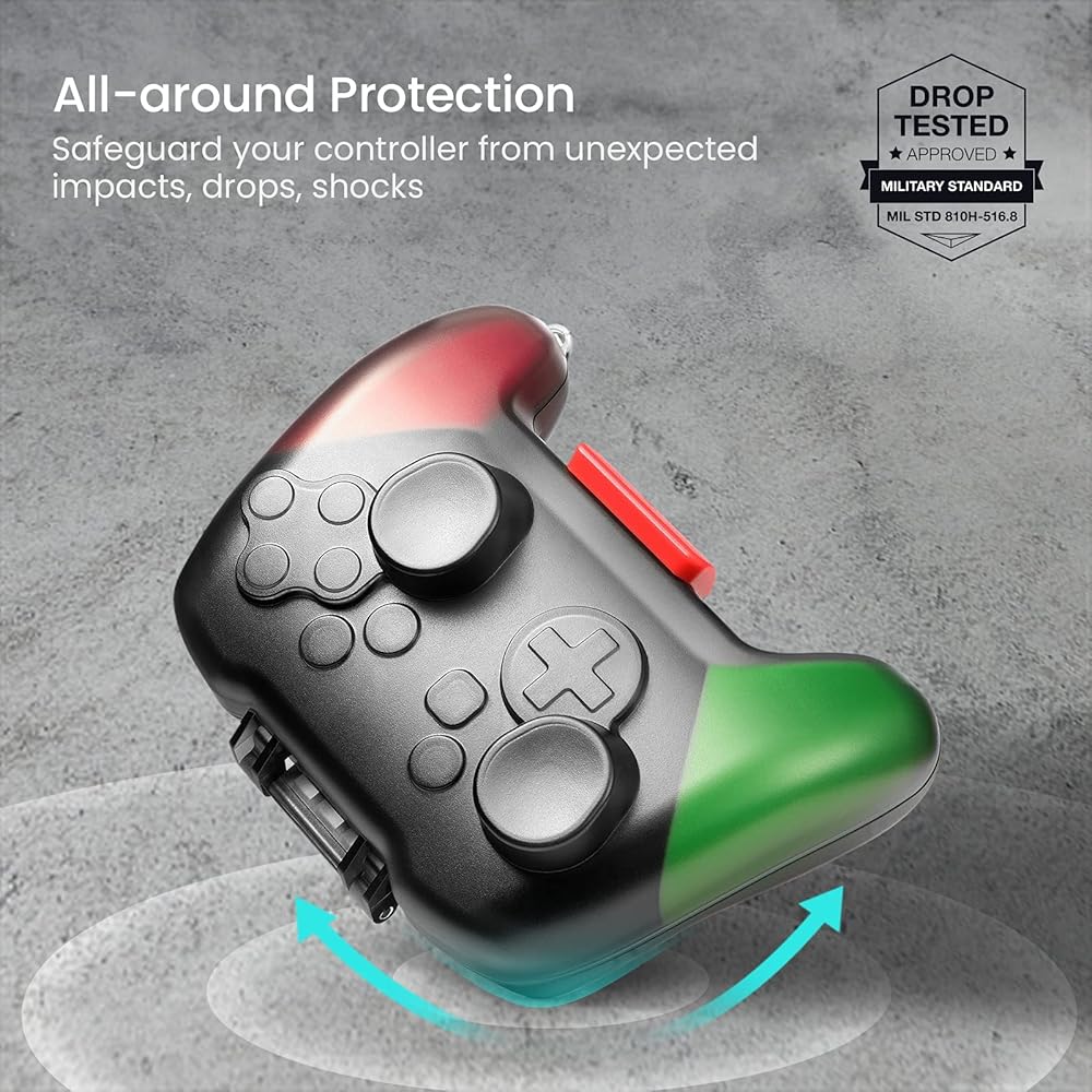 مناسب للسفر: يوفر التصميم النحيف ملاءمة محكمة وحجم تخزين صغير، مما يجعلك تشعر وكأنك تحمل جهاز التحكم الأصلي لجهاز Nintendo Switch Pro دون إضافة حجم إضافي.