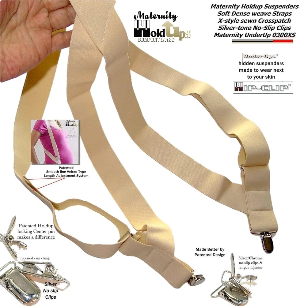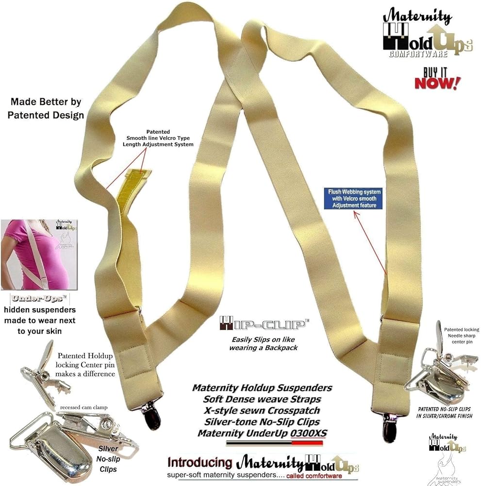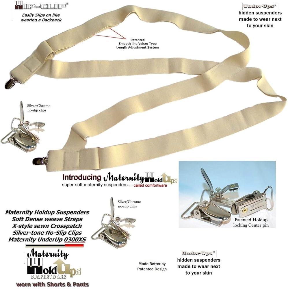 Finally the Perfect suspender to Holdup a pregnant woman's pants or shorts in total comfort and security. Maternity HoldUps have a unique side-clip design and a thick Ace Bandage type soft dense weave elastic fabric straps that attach with 2 patented clips at the side of your pants. The smooth no-line Hook-n-Loop length adjustment system is a real plus as is the trademarked Hip-Clip design means eliminates the digging or pressure on the delicate pregnant belly as these attach at the side of your pants. No matter how much you spend on maternity fashions these will be your go to choice for a solution to holding up your maternity pants. frustrated with today's cheaply made and poorly designed maternity pants, shorts and skirts. This Maternity Suspender model has silver no-slip metal center pin type clips that won't fray your clothes. These are 1 1/2" wide and up to 48" long (adjustable for average sized women). We also sell a Plus size Maternity suspender for the bigger woman as part of our Maternity Holdup suspenders in 2 styles with no-slip metal clips or Composite plastic Gripper Clasps in beige or black.. They're so comfortable you'll forget your wearing them after a few minutes and are a perfect Baby Shower gift. Our super soft, but strong, "Maternity Hold-Up Suspenders are part of our comfortwear line of UnderUp hidden suspenders.