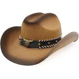 【Unique Design】This cowboy hat has a classic Western style, is made of woven material, and presents a gradient color tone. It has a tall crown and a wide brim, and is decorated with a leather hatband featuring rivets and a bull head design, combining a sense of fashion and practicality.