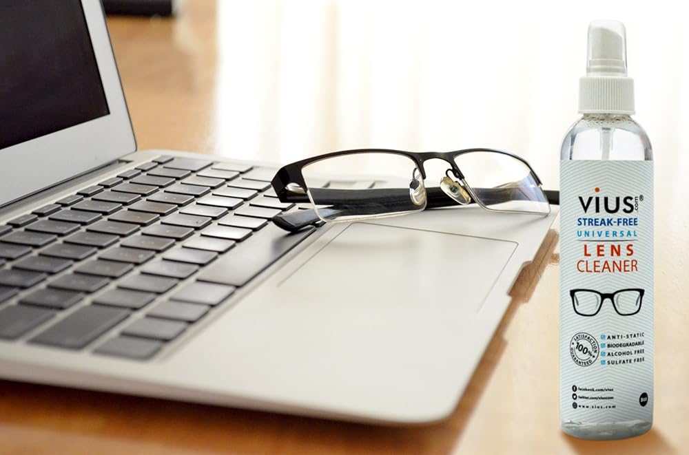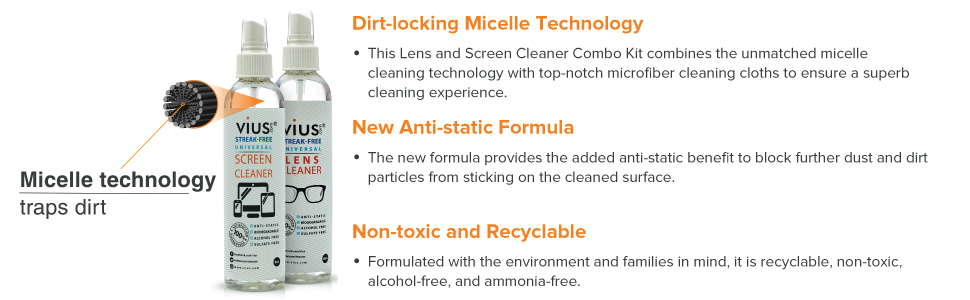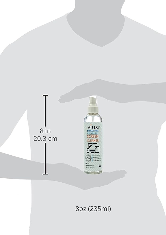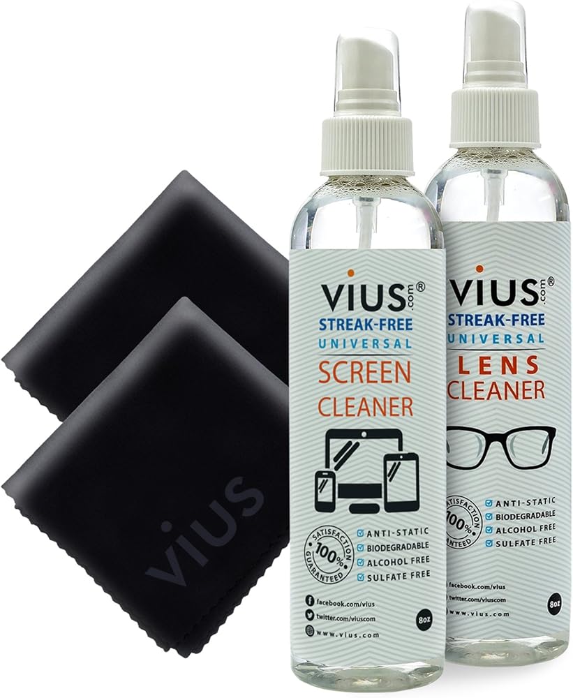طقم العدسة والمنظف - بخاخات نظافة Vius مع ملابس الألياف الدقيقة للعدسات ، النظارات ، وأجهزة الكمبيوتر ، والأقراص ، والهواتف ، وأجهزة التلفزيون ، وأجهزة الكمبيوتر المحمولة - تنظف بصمات الأصابع ، والغبار ، والزيت (8 أوقية 2 عبوة)