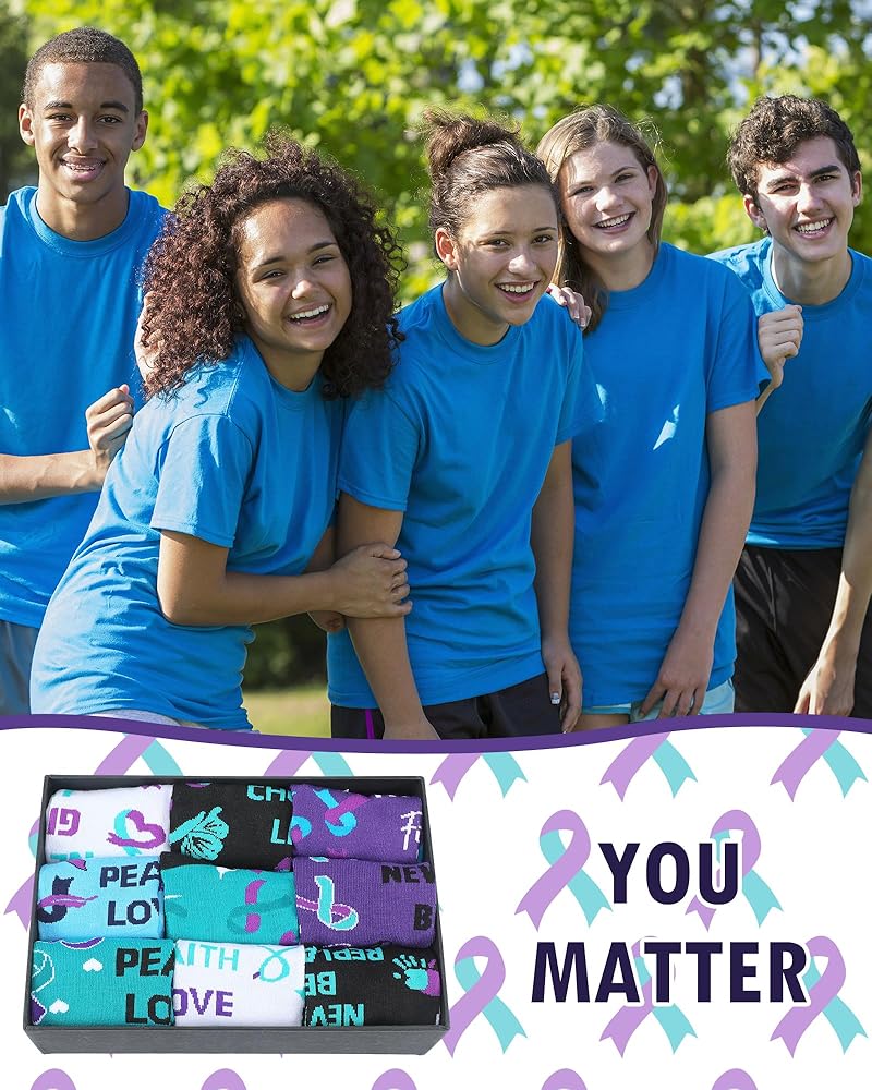 Receive 20 pairs of suicide prevention socks in 10 styles, 2 pairs per style. They're perfect for sharing with friends, support groups or at fundraising events. The socks feature classic blue purple awareness ribbons, butterflies and rainbows. Soles are printed with inspiring slogans like "You are important" and "Peace, love, hope", showing your commitment to suicide prevention and mental health advocacy. Made of a blend of quality cotton and polyester, they're comfortable, elastic and breathable, suitable for wear at work, school or home.