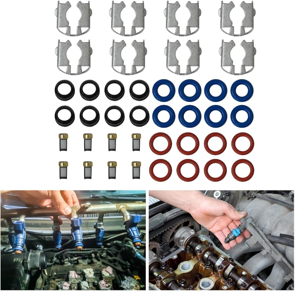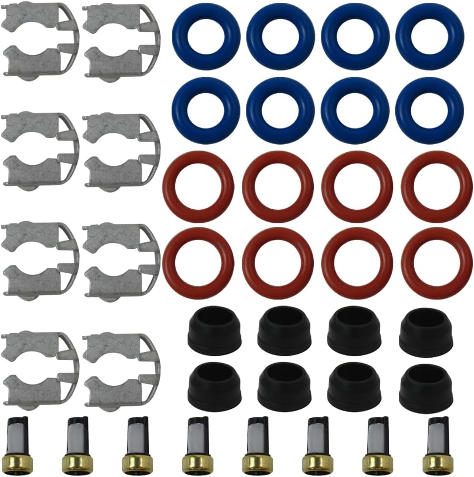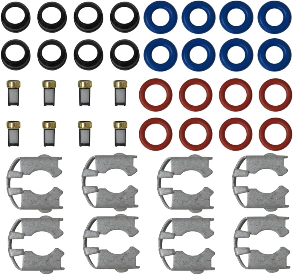 【Package Includes】 This fuel injector repair kits include 8 micro filters, 8 injector O-ring, 8 injector fuel rail buckle, 8 injector lower O-ring, 8 injector Pintle Cap as pictured.