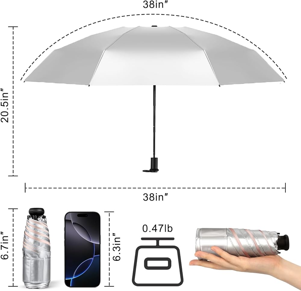 Compact and Lightweight Design: Weighing only 0.47lbs and 38" umbrella folding down to 6.7 inches, this mini umbrella is effortlessly portable. Fits into purses, backpacks, or pockets—perfect for travel, hiking, or daily commutes