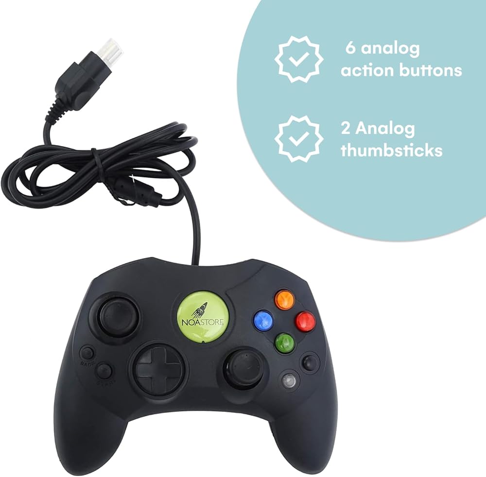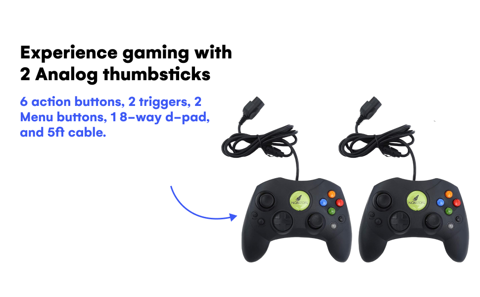 BUTTONS – 2 Analog thumbsticks, 6 analog action buttons, 2 analog triggers, 2 Menu navigation buttons, 1 eight-way directional pad, 5 feet of cable
