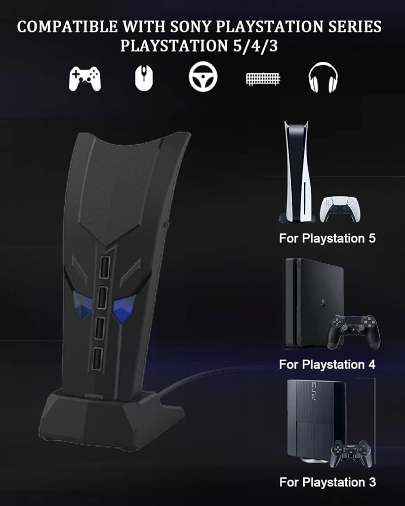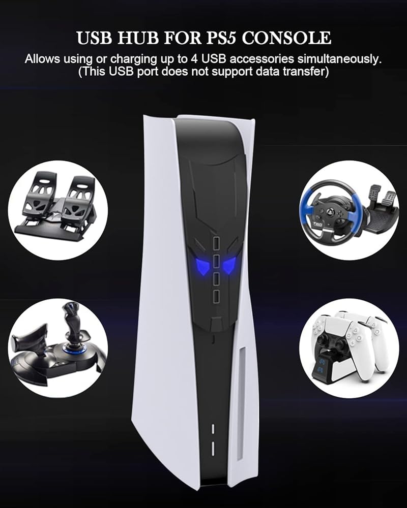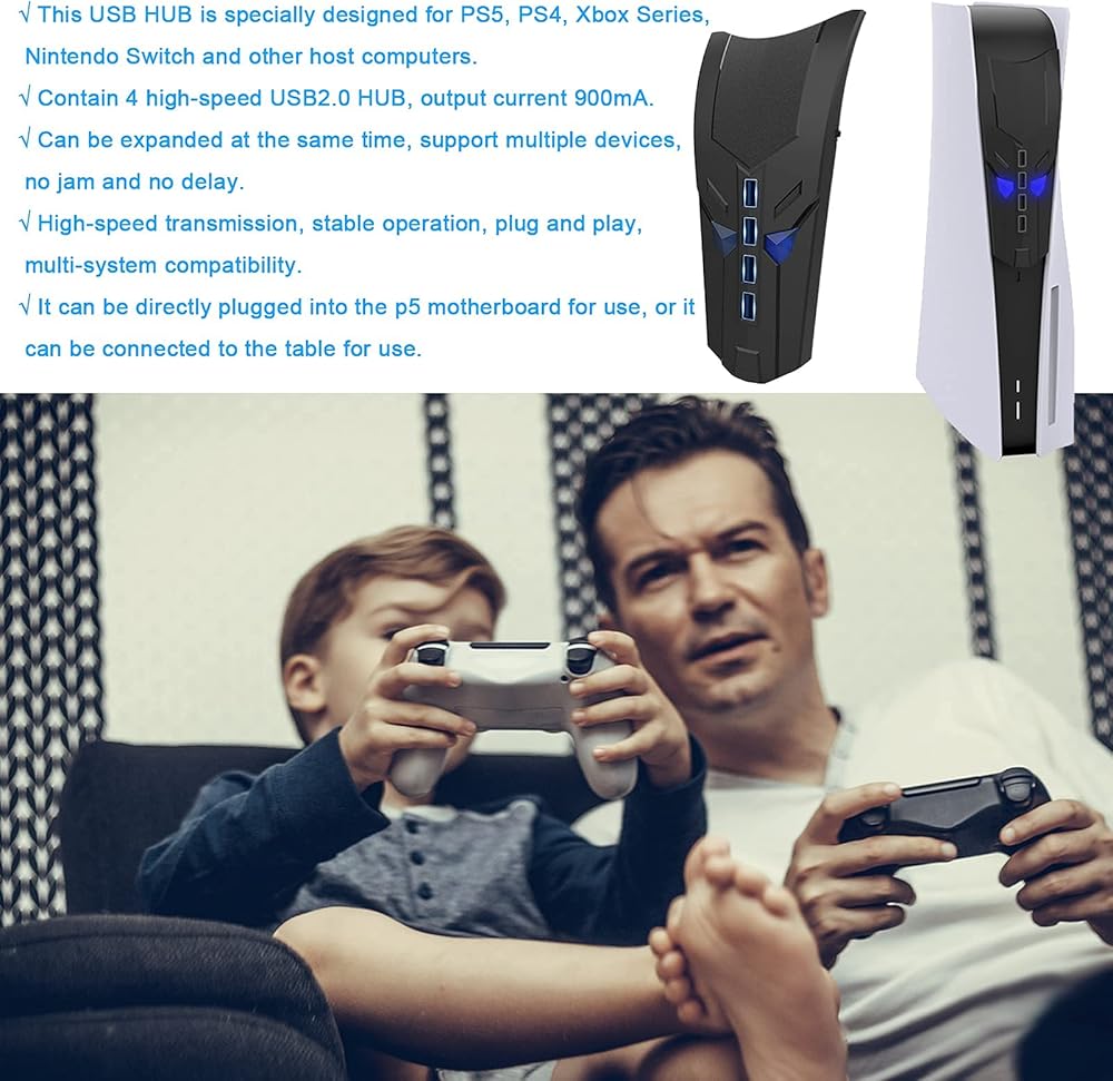 [توافق واسع] - منفذ USB يحتوي على 4 منافذ USB 2.0 يمكن استخدامها للأجهزة الخارجية، مثل شحن وحدة التحكم بلايستيشن 5، عجلة ودواسة معدل الألعاب، لوحة المفاتيح والماوس أو أجهزة ألعاب USB الأخرى. (يرجى ملاحظة: لا يعمل مع يو ديسك / وحدة معالج PSVR / كاميرا PSVR مع محول USB. منفذ USB واحد فقط يمكنه دعم الشحن السريع للحس المزدوج أو الهاتف الذكي.)