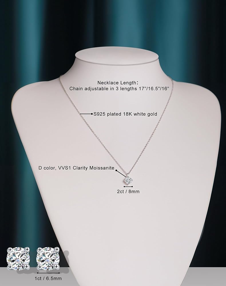 [مواد S925 عالية الجودة من مجموعات المجوهرات النسائية] ستتلقى زوجًا من أقراط مسمار مويسانيت 0.5CT/5MM وطول 17 "(سلسلة قابلة للتعديل في 3 أطوال 17" /16.5 "/16") 1CT/6.5MM S925 مقاس الذهب الأبيض 18K. د اللون ، وضوح VVS1. جميع المعادن هي hypoallergenic. قلادات أقراط مسمار الماس خفيفة الوزن وآمنة ومريحة للارتداء ومناسبة للبشرة الحساسة