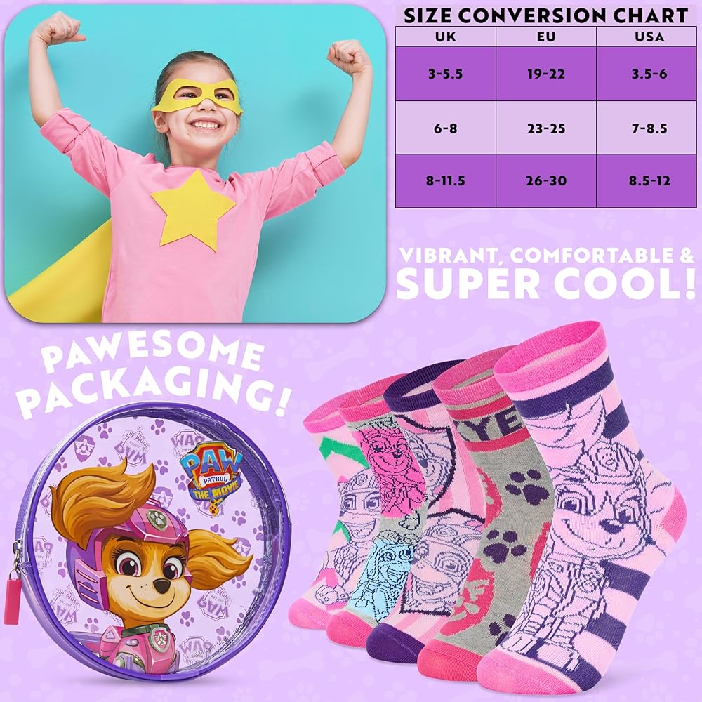 Paw Patrol Kids Socks - Feel like part of the canine crew with our pack of 5 Paw Patrol socks for girls. These crew socks are crafted with stretchy and breathable material, providing all-day comfort, and the fun and vibrant designs will add a touch of style to any outfit!