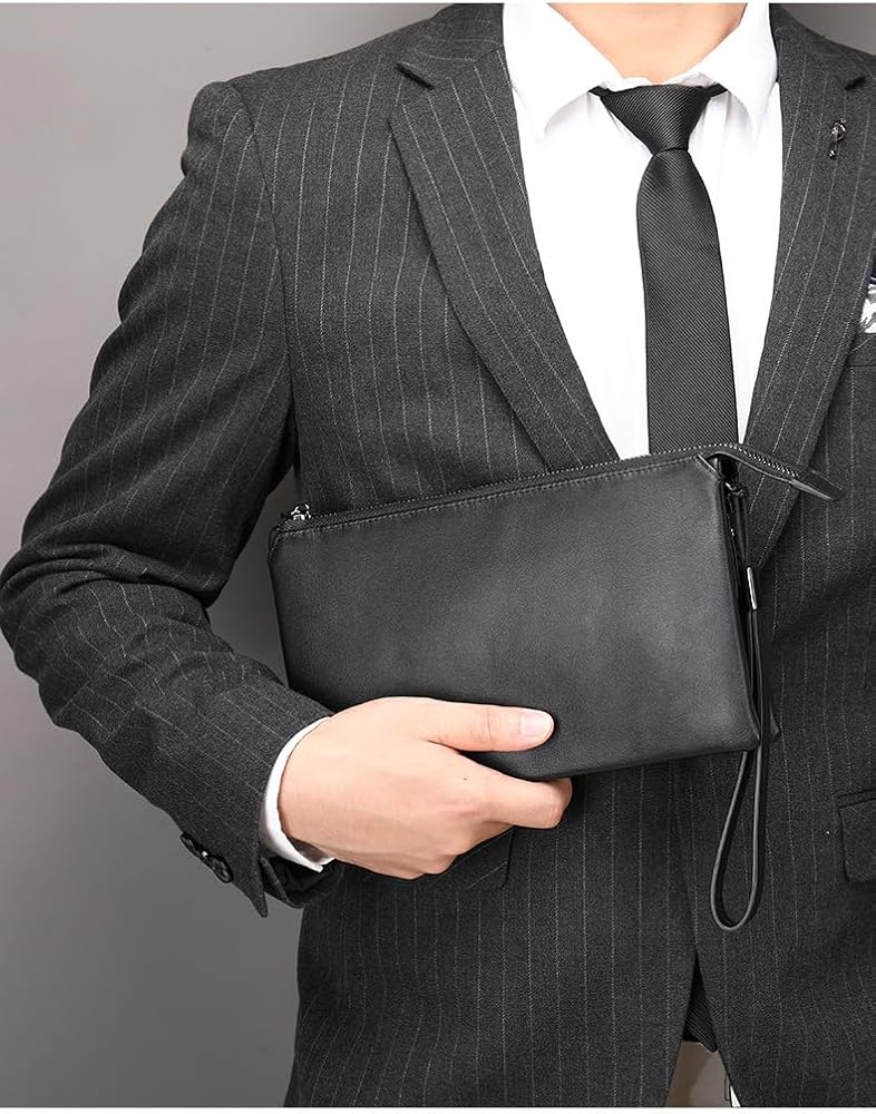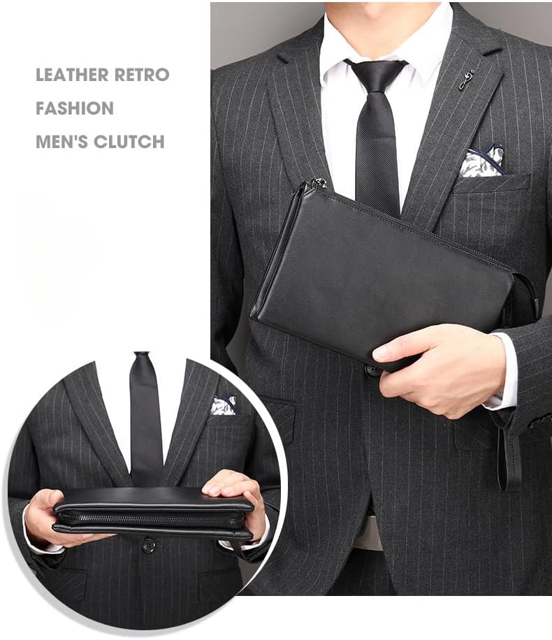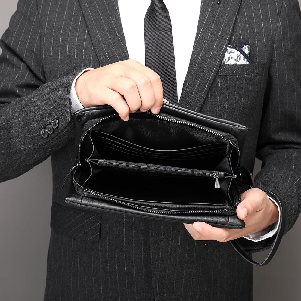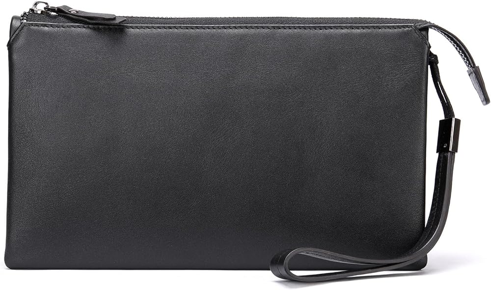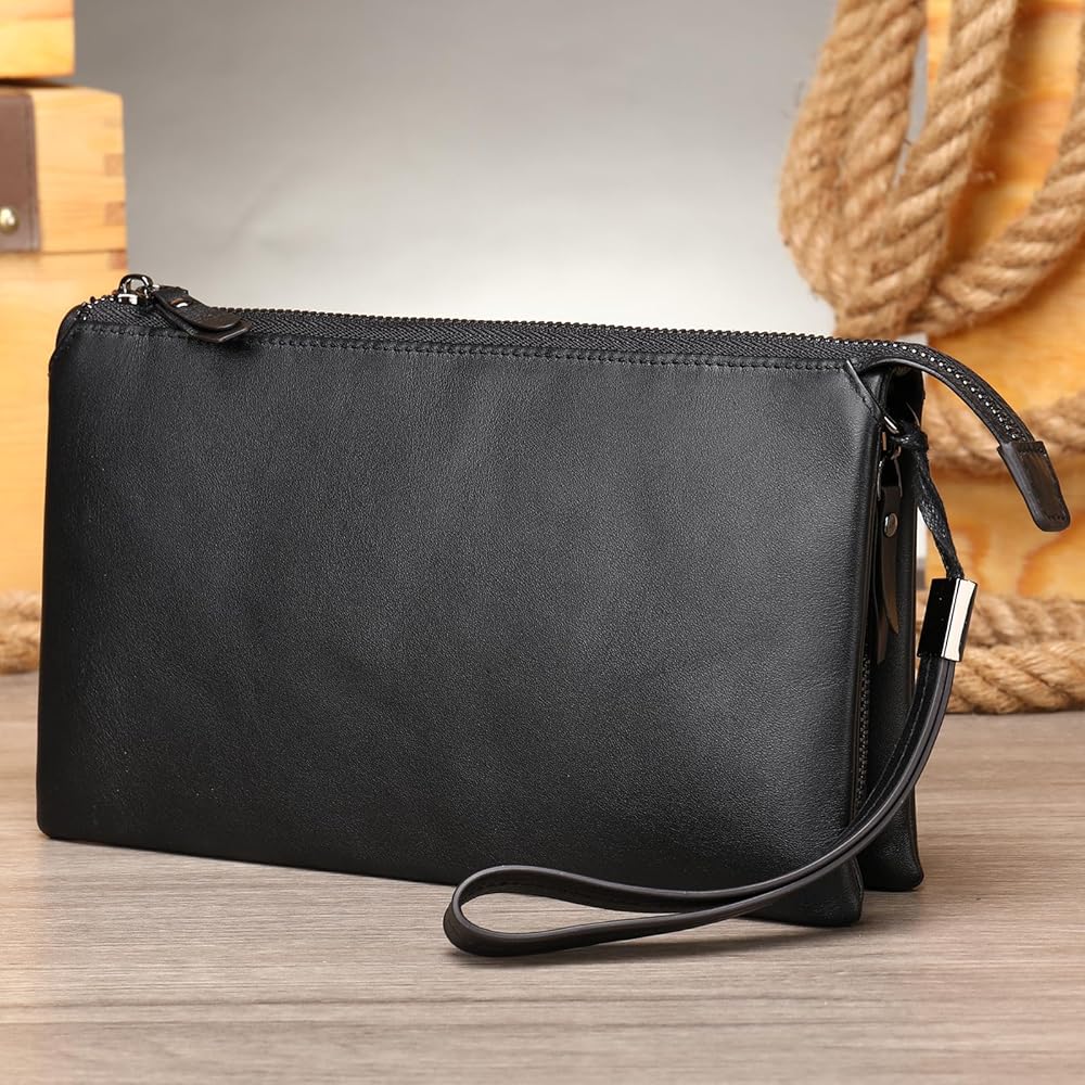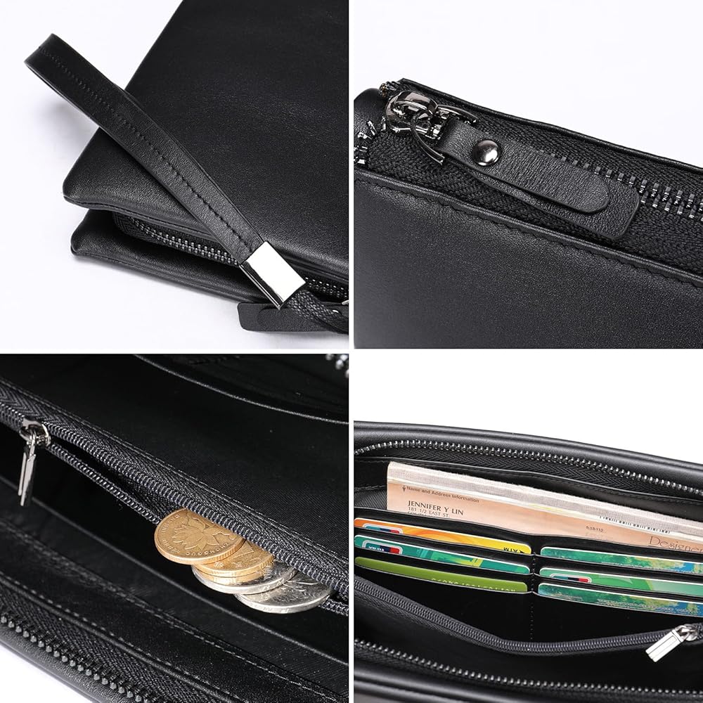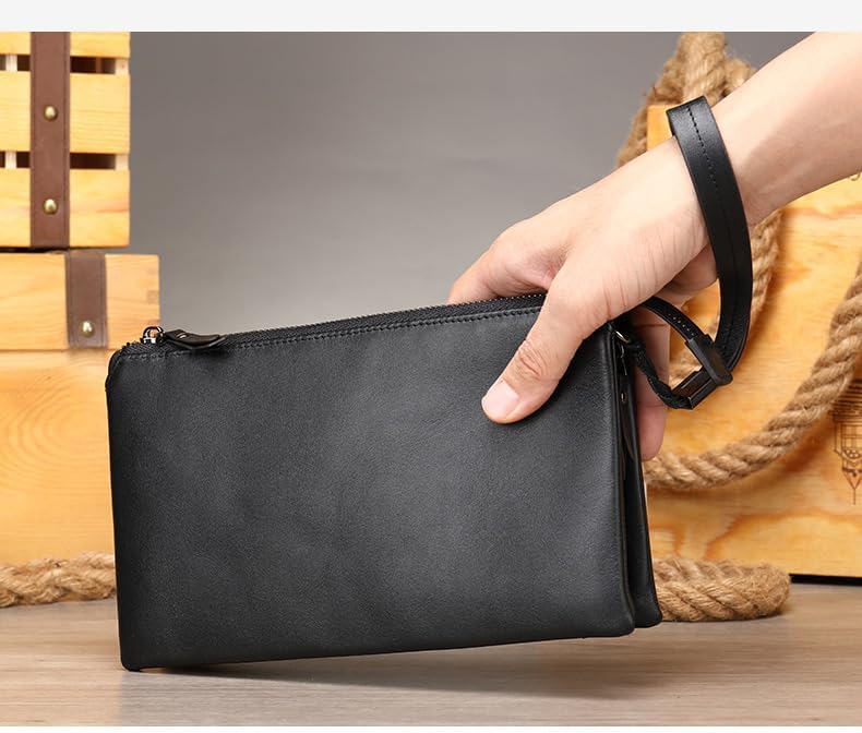 محفظة القابض الجلدية التنفيذية للرجال - محفظة أعمال سحاب مع حزام معصم وسفر منظم باللون الأسود