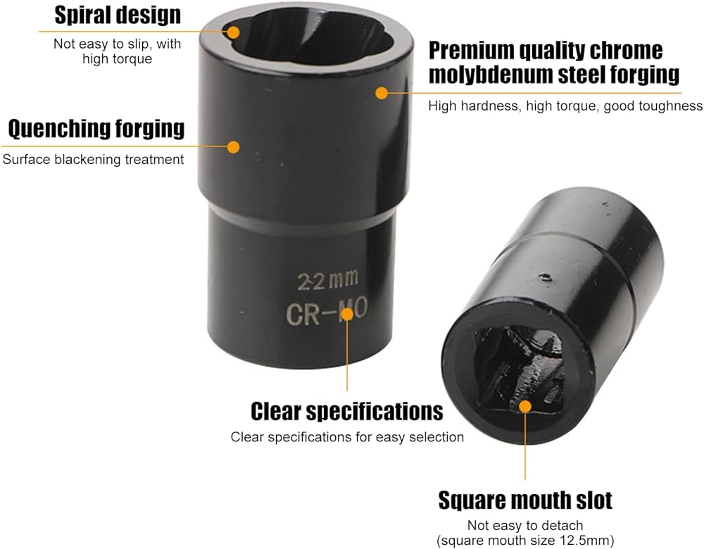 [Industry-strength material] Crafted from heat-treated alloy steel molybdenum steel our lug nut remover boasts exceptional hardness and durability. The advanced heat treatment process ensures the sockets maintain their shape under extreme torque while the wear-Tough construction guarantees long-lasting performance. These professional-grade tools won't deform or crack even after repeated use on tough wheel locks.