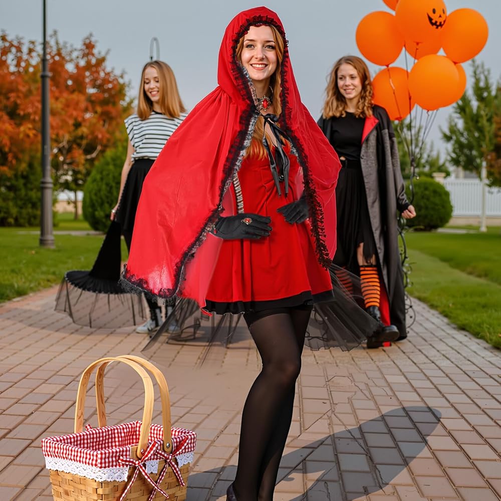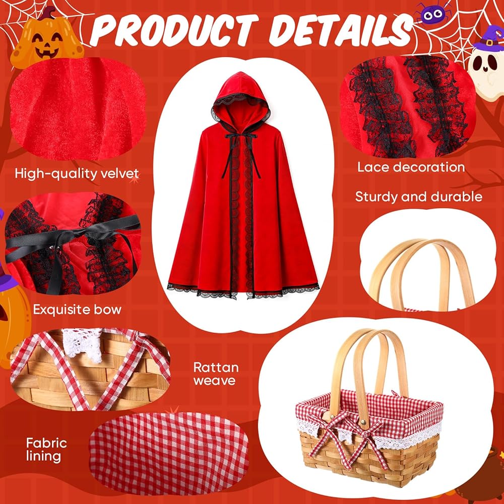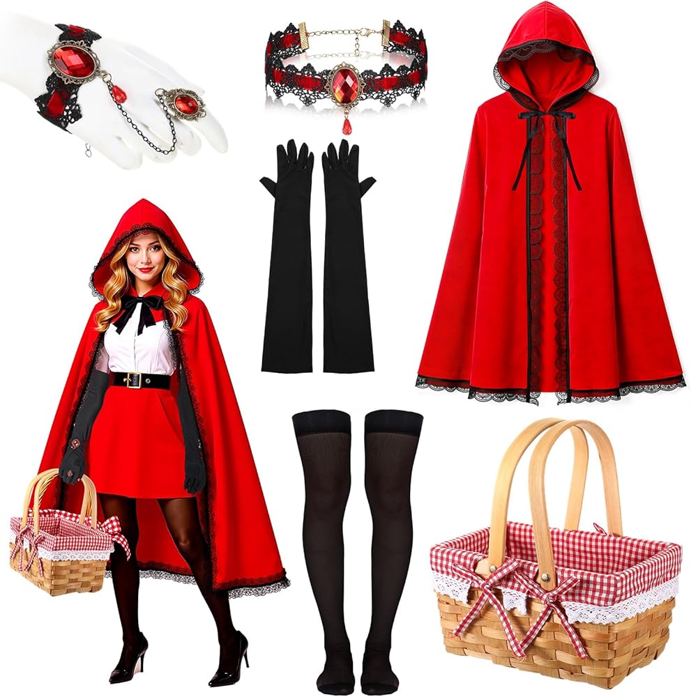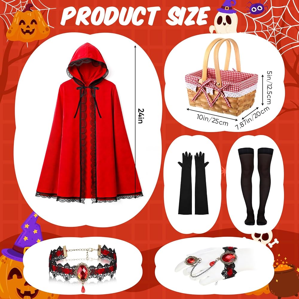 Size: red cape for women is about 31.5 inches long, wicker baskets with handles measure about 10 x 7.87 x 5 inches, Gloves and stockings come in one size to fit most people
