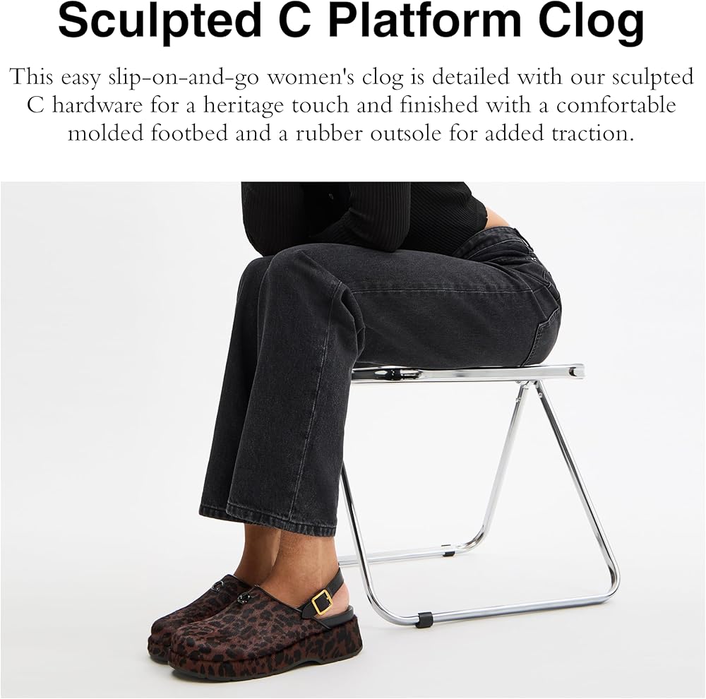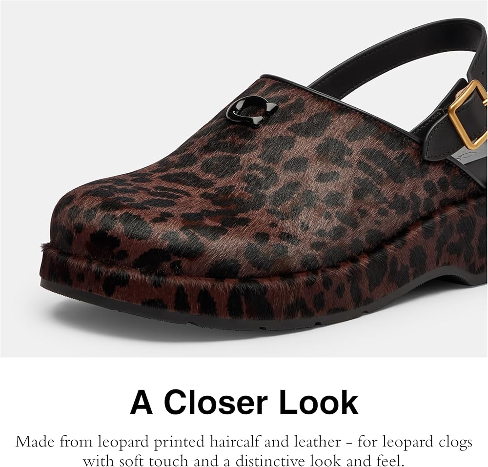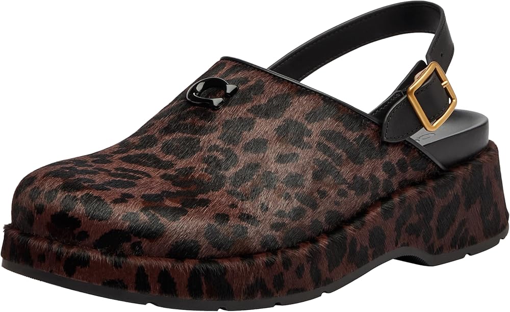 Crafted with a printed haircalf upper, this womens clog is detailed with our sculpted C hardware for a heritage touch. These easy slip-on-and-go Coach clogs are finished with a comfortable molded footbed and a rubber outsole for added traction.