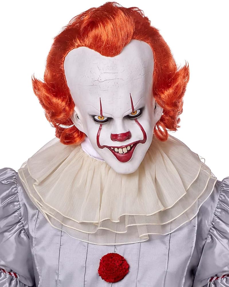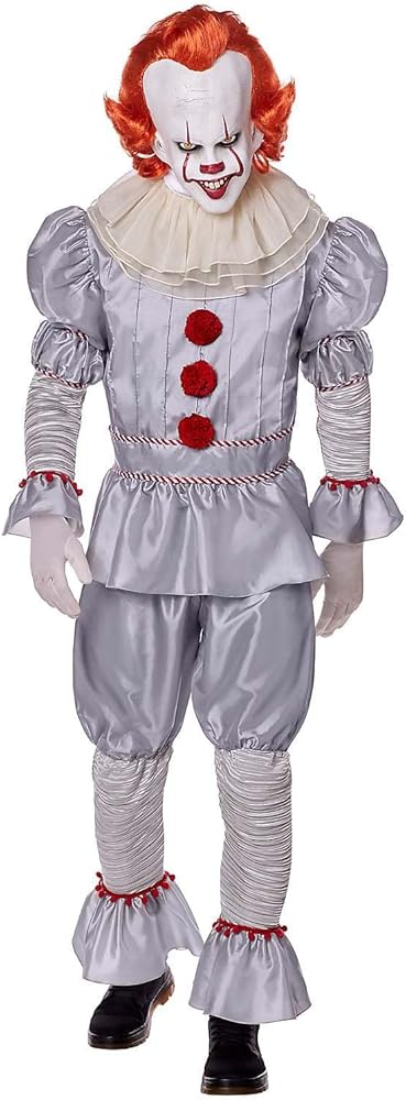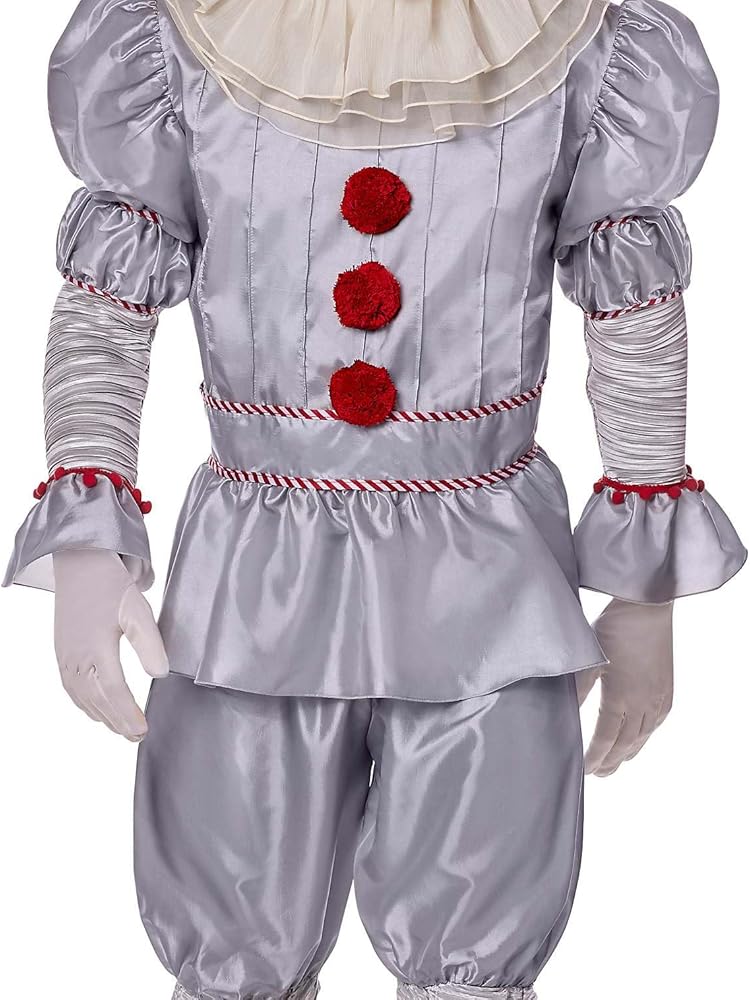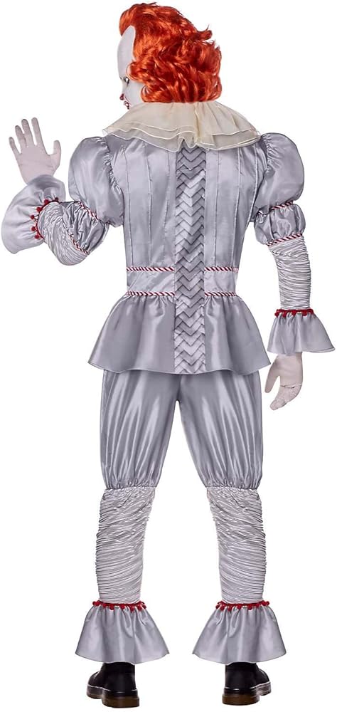 From our exclusive signature collection. Crave the sweet taste of fear this Halloween when you suit up in this officially licensed Deluxe Pennywise Costume. This deluxe costume features a complete film-inspired Pennywise outfit, including a gray pleated shirt, ruffled clown pants and collar, and a chilling latex mask with fiery red hair and a wicked smile. Look like you've just crawled out from the depths of Derry's sewers in this high-quality Pennywise costume.