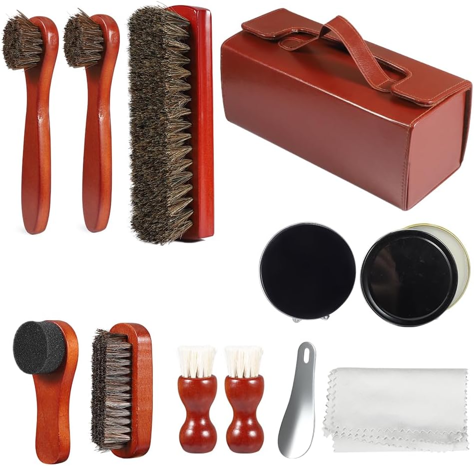 Real Wood Handle & Full Kit - Reddish-brown wood handles for durability. Package includes 6 brushes, 2 cloths, shoehorn, sponge, and case.