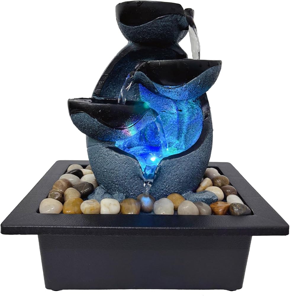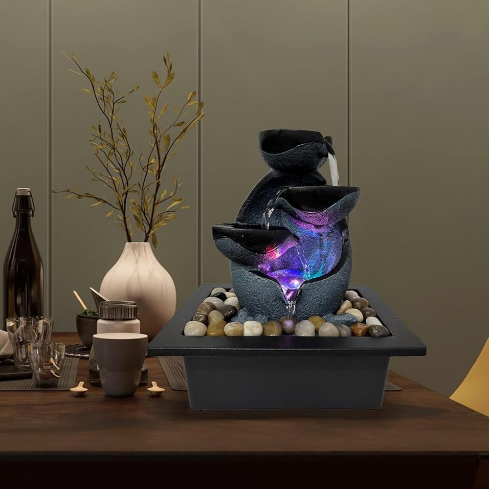 【Decorative Waterfall Fountain】Crystal-like orb spins as water cascades down four tiers of stone-like layers creating a calming ambiance and all the while actually helping to achieve healthier air humidity levels all around you.