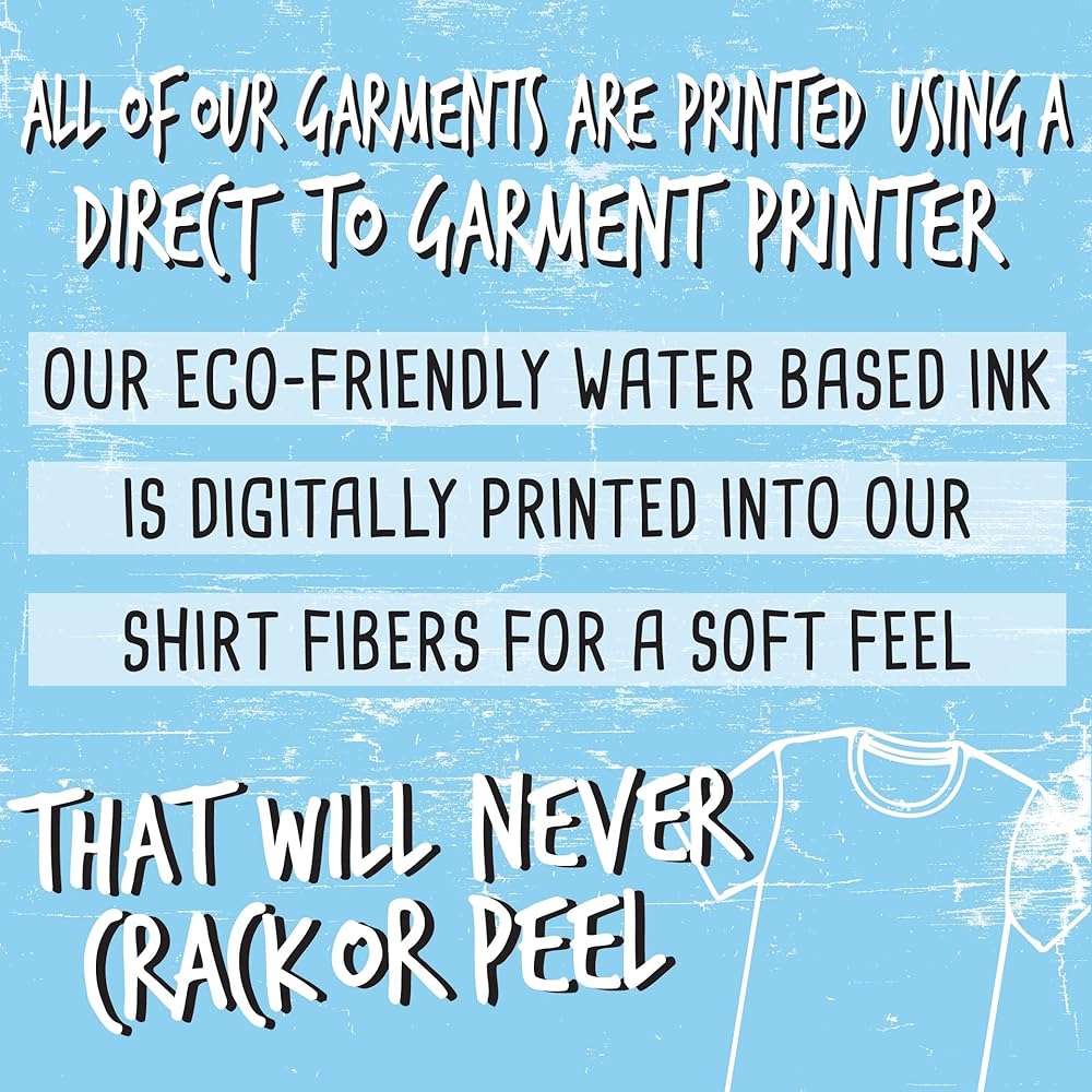 • Our eco-friendly water-based ink prints directly into our shirt fibers for a smooth feel that provides a less vibrant, lived-in look. (No cracking or peeling like screen printing or iron-on transfers)
