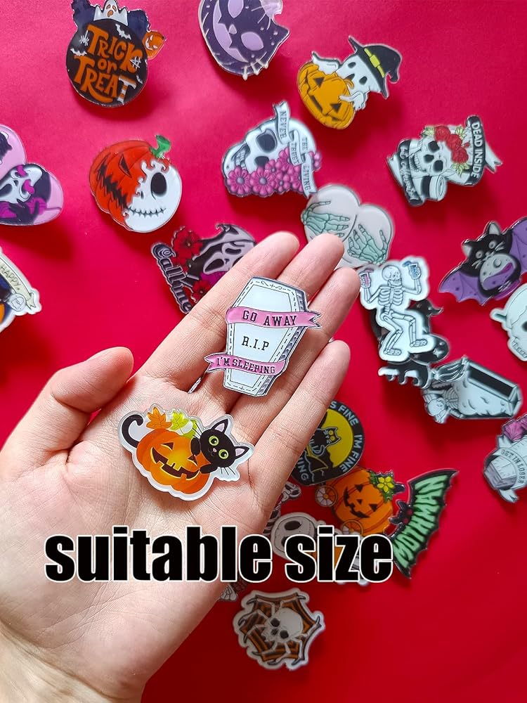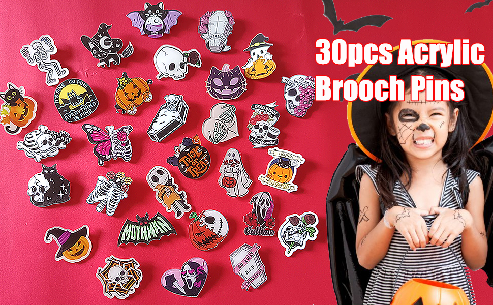 مجموعة دبابيس بروش أكريليك لطيفة في عيد الهالوين - 30pcs جمجمة اليقطين شبح القطة دبابيس زخرفية لحقائب الظهر والملابس والحقائب والقبعات - إكسسوارات عيد الهالوين DIY