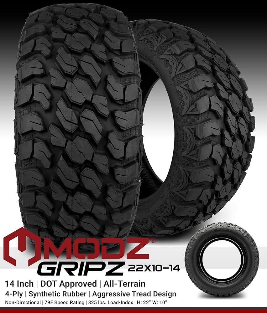 [إطارات من الدرجة العلوية] Modz Gripz (22x10-14) هو إطار عربة غولف من 4 طبقات. تعظيم التحكم والجر في التضاريس الوعرة ، تتميز هذه الإطارات بحواف عض مع تصميم فقي عدواني تم تصميمه للمغامرة والأناقة. مع بنية صلبة تفتخر بزيادة مقاومة الثقوب والدموع وغيرها من التآكل من البيئات الصعبة.