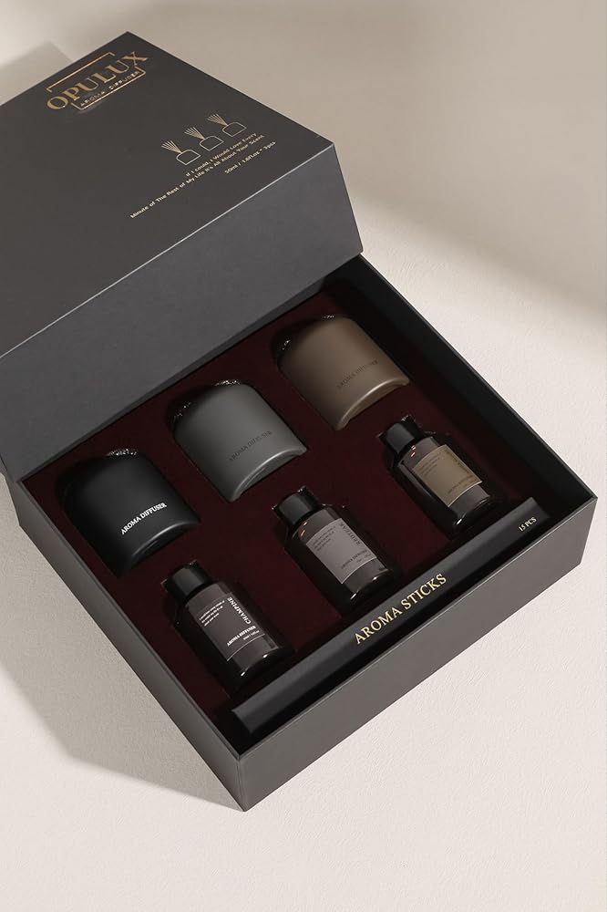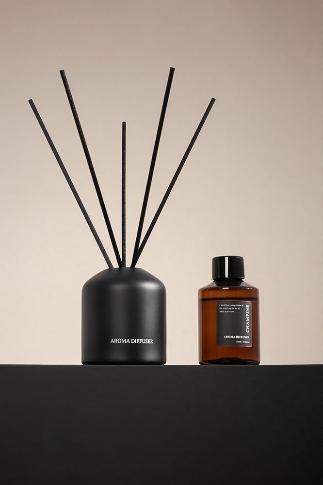 LUXURY SET: Premium collection of 3 reed diffusers featuring sophisticated scents - Champagin, Amber Allure, and Readteak in elegant black, grey, and brown bottles REDTEAK: woody/musky scent CHAMPAGIN: sweet fruit/purfume scent AMBER ALLURE: sweet vanilla scent